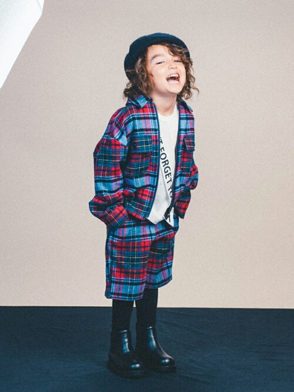 【branshes】 チェック柄を着るならセットアップ!! 主張しすぎない赤ベースのチェック柄 ジップアップのジャケットが スマートに着こなせます♪ ※ベレー帽、ブーツは近日発売予定 身長:108㎝ 着用:110cm