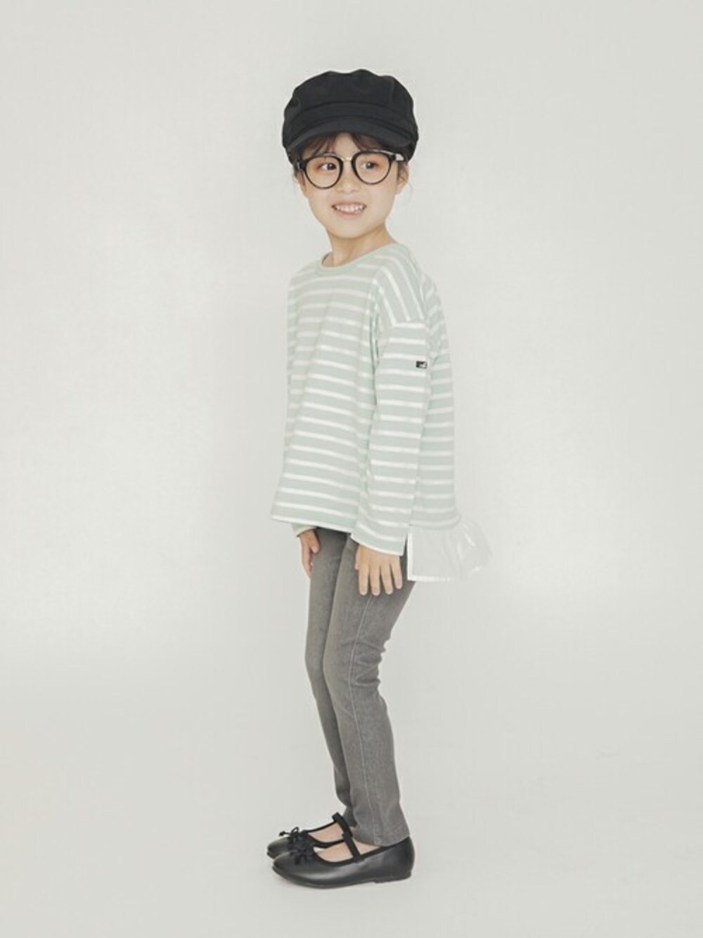 【branshes】 WEB限定♡ボーダー長袖Tシャツ 後ろのフリルが女子力UP♡ 落ち着いたオリーブカラー♪ ボトムスの色を変えれば春先まで着れちゃいますね♪ 身長:106.5㎝ 着用:110cm