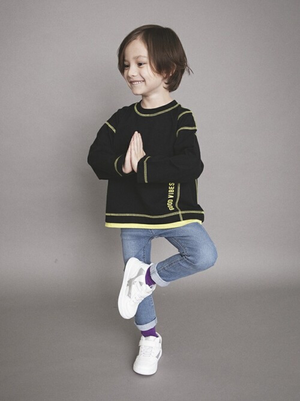 【branshes】 配色ステッチ長袖Tシャツ 差し色の黄色がPOP♪ デニムにはもちろん、 ゆったりシルエットのテーパード系 カラーパンツにもおすすめです◎ 身長:110cm 着用:110cm