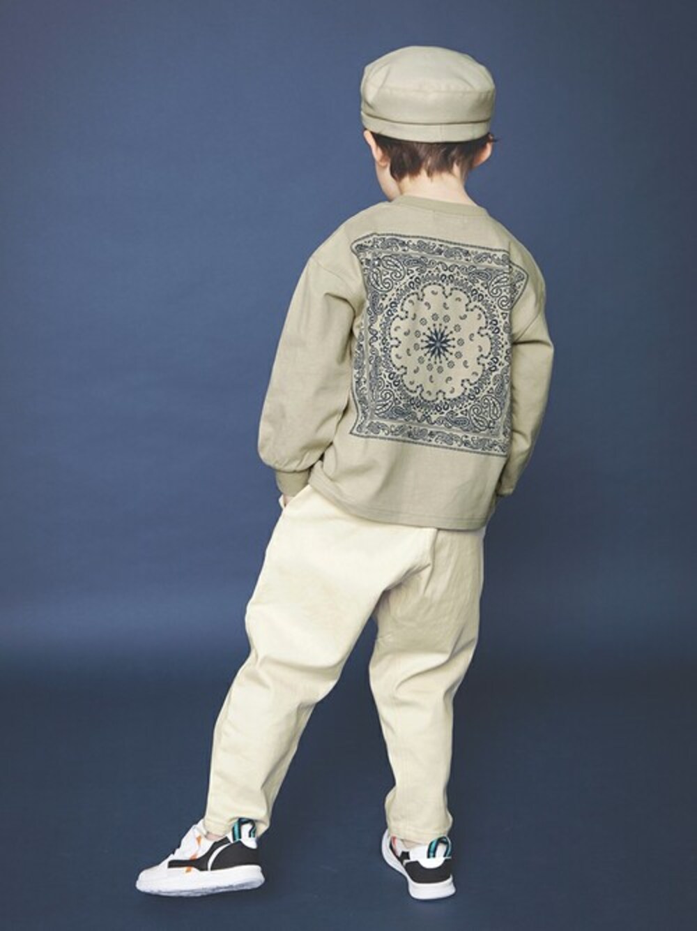 【WEB限定】バンダナバックプリント長袖Tシャツ 飽きのこないバンダナ柄。 上級ワントーンコーデでまとめるのがステキです♪ 身長:113cm 着用:110cm