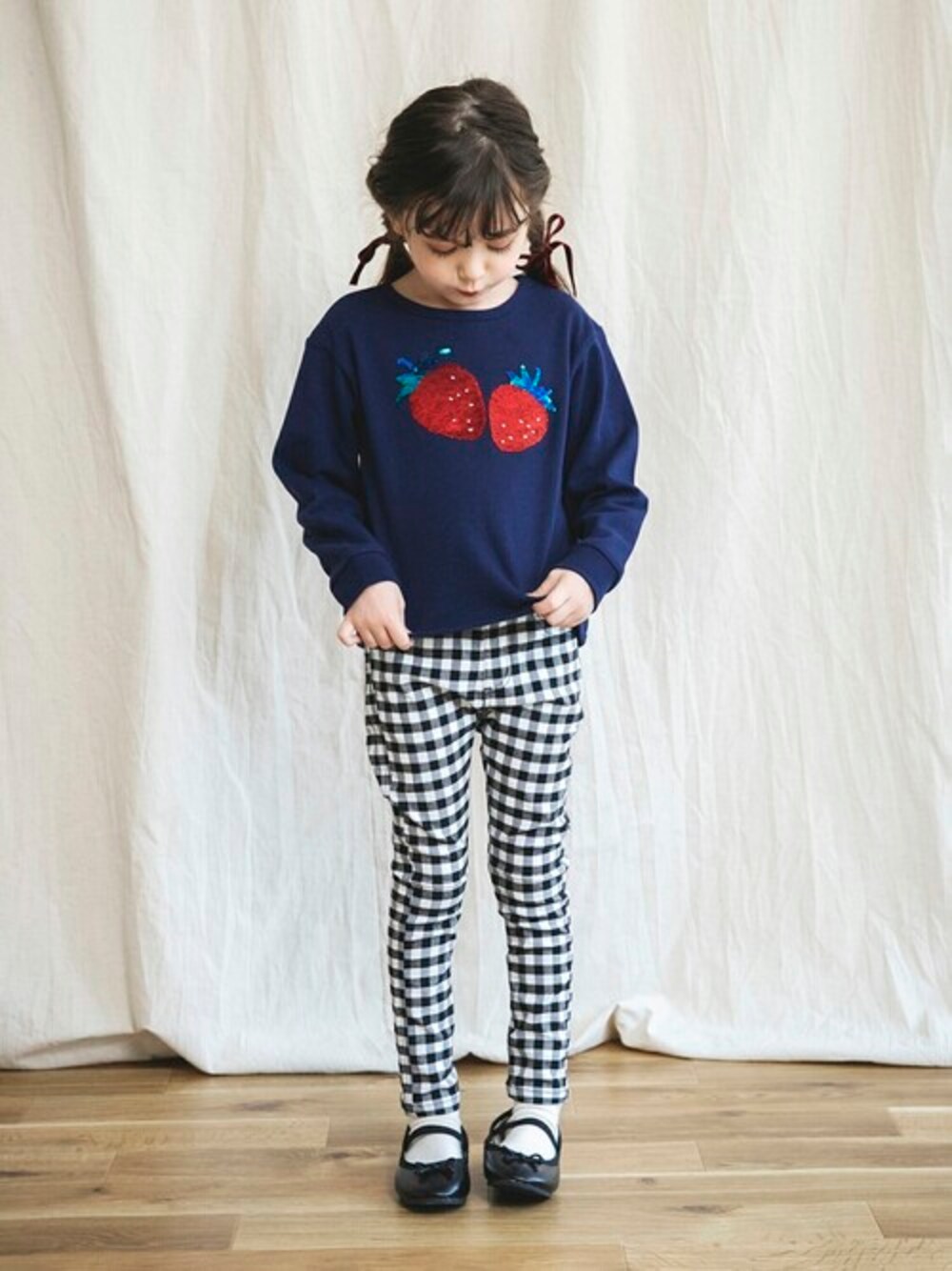 【branshes】 スパンコール×フルーツモチーフトレーナー &ギンガムチェック柄/ドット柄プレミアムストレッチパンツ スパンコールのいちごはなでると 色が変わります🍓✋゛ 身長:111㎝ 着用:110㎝