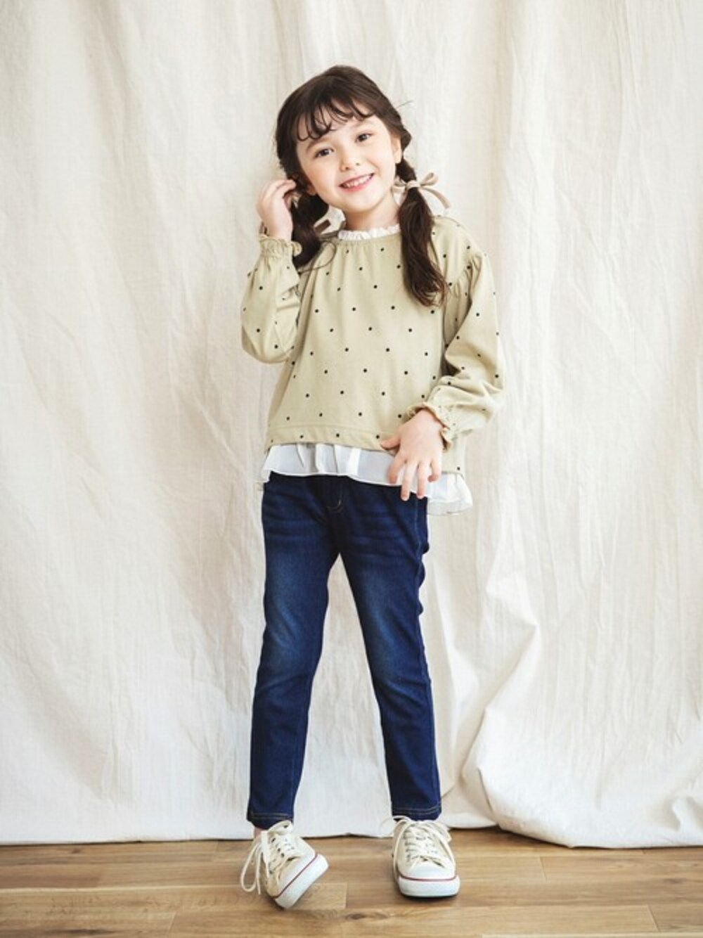 【branshes】 ドット柄×フリル長袖Tシャツ &デニムニットロングパンツ トップスのフリルはくっついています◎ 通園通学も可愛く🎒 身長:111㎝ 着用:110㎝