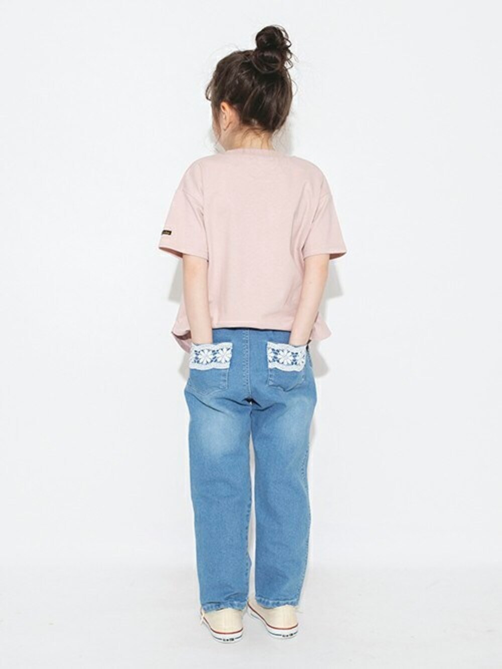 【branshes】 【WEB限定 / 綿100%】シンプル半袖Tシャツ シンプルなトップスはちょうどいいい丈感♪ レースのポッケがカワイイ ポケットレース付きストレートパンツと合わせて♡ 身長:113cm 着用:110cm