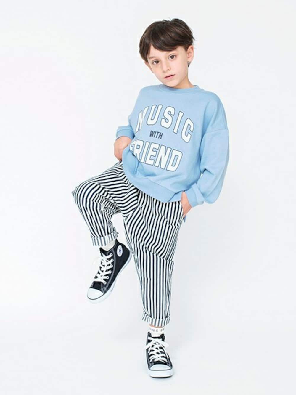 \\\ SPRING STYLE /// ブランシェスの定番、ガーデナーテーパードパンツに 明るいサックスのトレーナーを合わせて さわやかな印象に◯ --------------- 身長:116cm 着用:120cm ---------------
