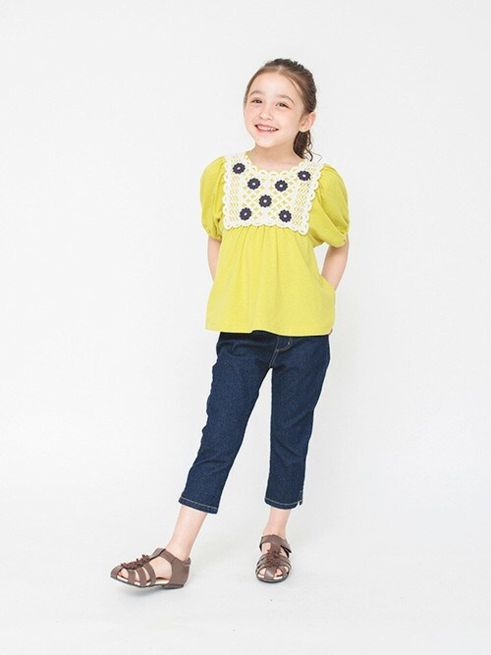 △▼△▼ SUMMER STYLE △▼△▼ トップスはオリジナル柄のかぎ針編みと、お花のモチーフがポイント デニムを合わせてカジュアルに♡ --------------- 身長:115cm 着用:120cm ---------------