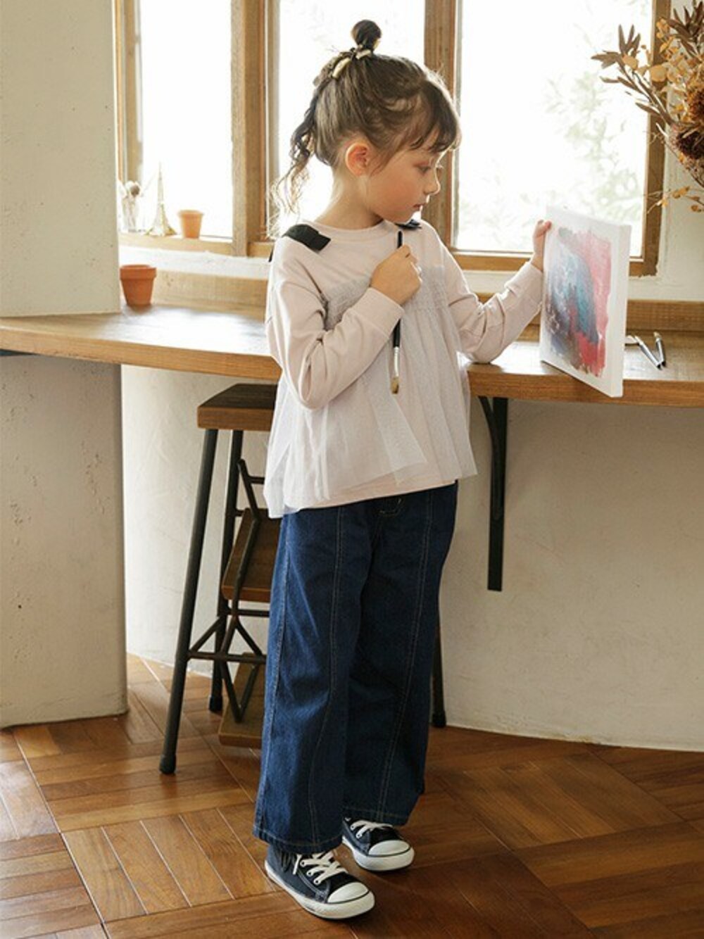 1枚で華やか、チュールレースがドッキングされた長袖Tシャツです。 ラメチュールと肩のリボンがポイント♪ デニムワイドパンツとのコーディネートもGOOD!