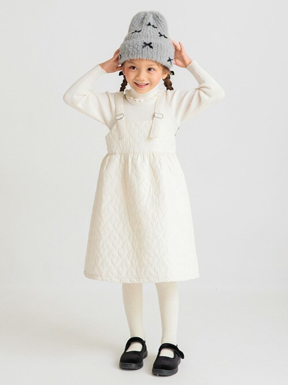 ハートを交互にあしらった模様が可愛いキルティングジャンパースカートです♪ 軽い着心地で使い勝手が良いキルティング素材は日常使いにおすすめ! 同じ生地の02-4435-011 ベビーキルティングジャンパースカートとおそろいコーデも出来ます。