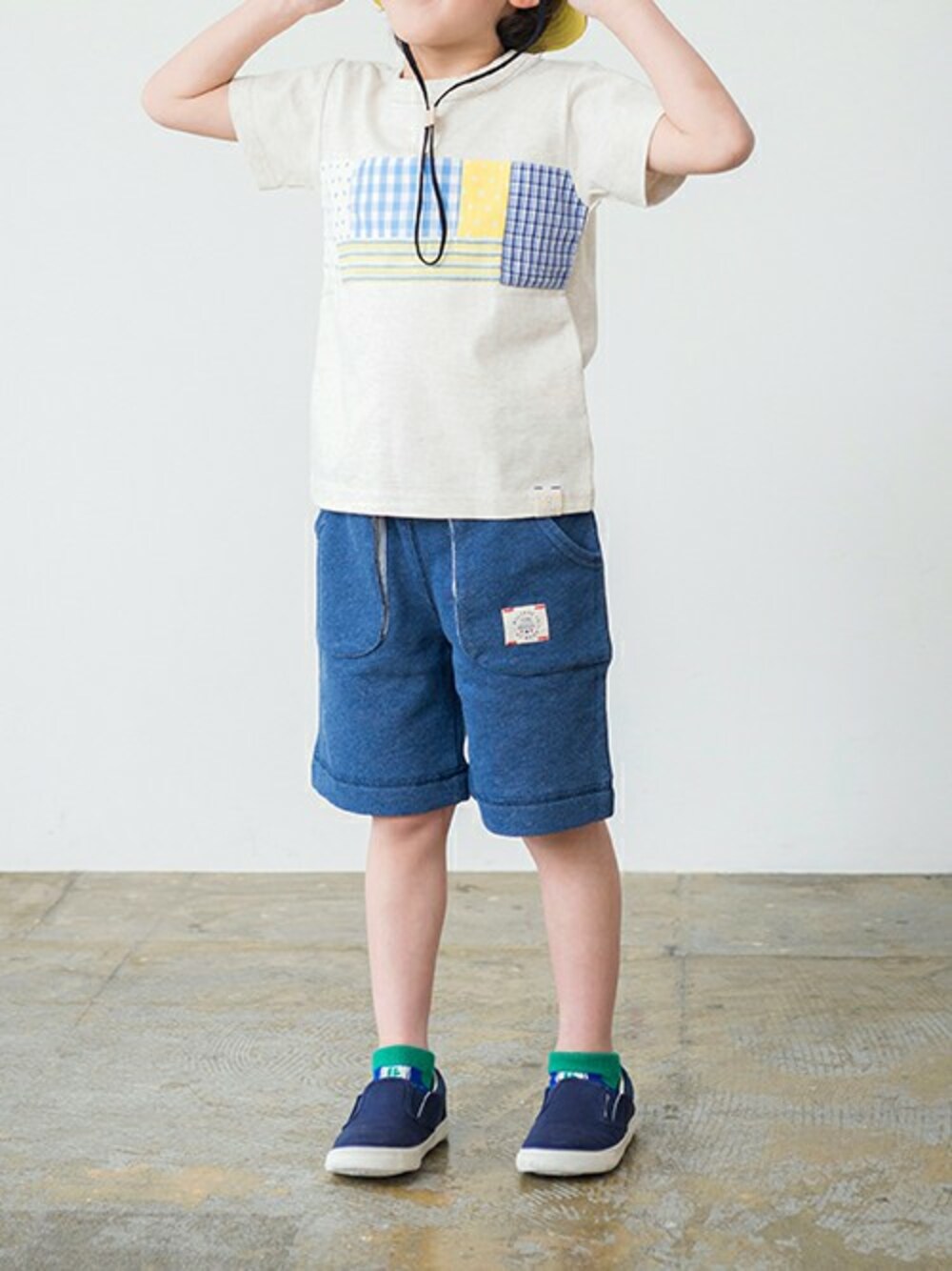 着用サイズ110㎝ ブランシェス人気の異素材使いの半袖Tシャツはパッチワーク風のデザインがポイントです!ポケットのマチに使用したストライプがポイントのリラックスムードのスエットパンツをコーディネートすれば、ナチュラルスタイルの完成です!