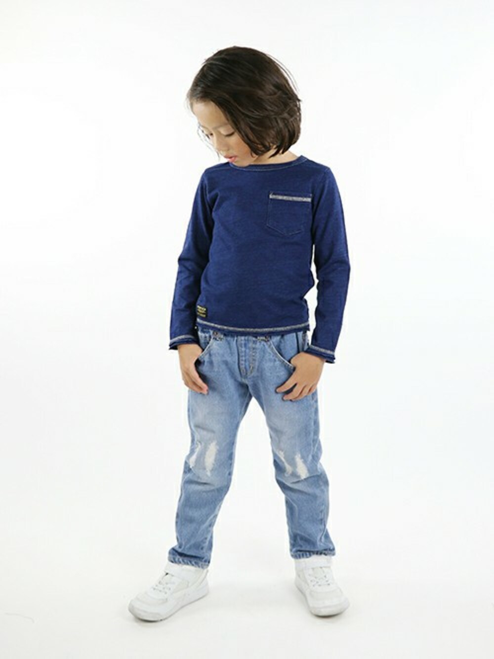 モデル:身長111センチ 着用サイズ 110センチ<br> インディゴ染料で染めて加工感を加えたシンプルな長袖Tシャツ。裾と袖口は切りっ放しデザインでラフに仕上げた1枚。ベーシックながら存在感のある長袖Tシャツです。