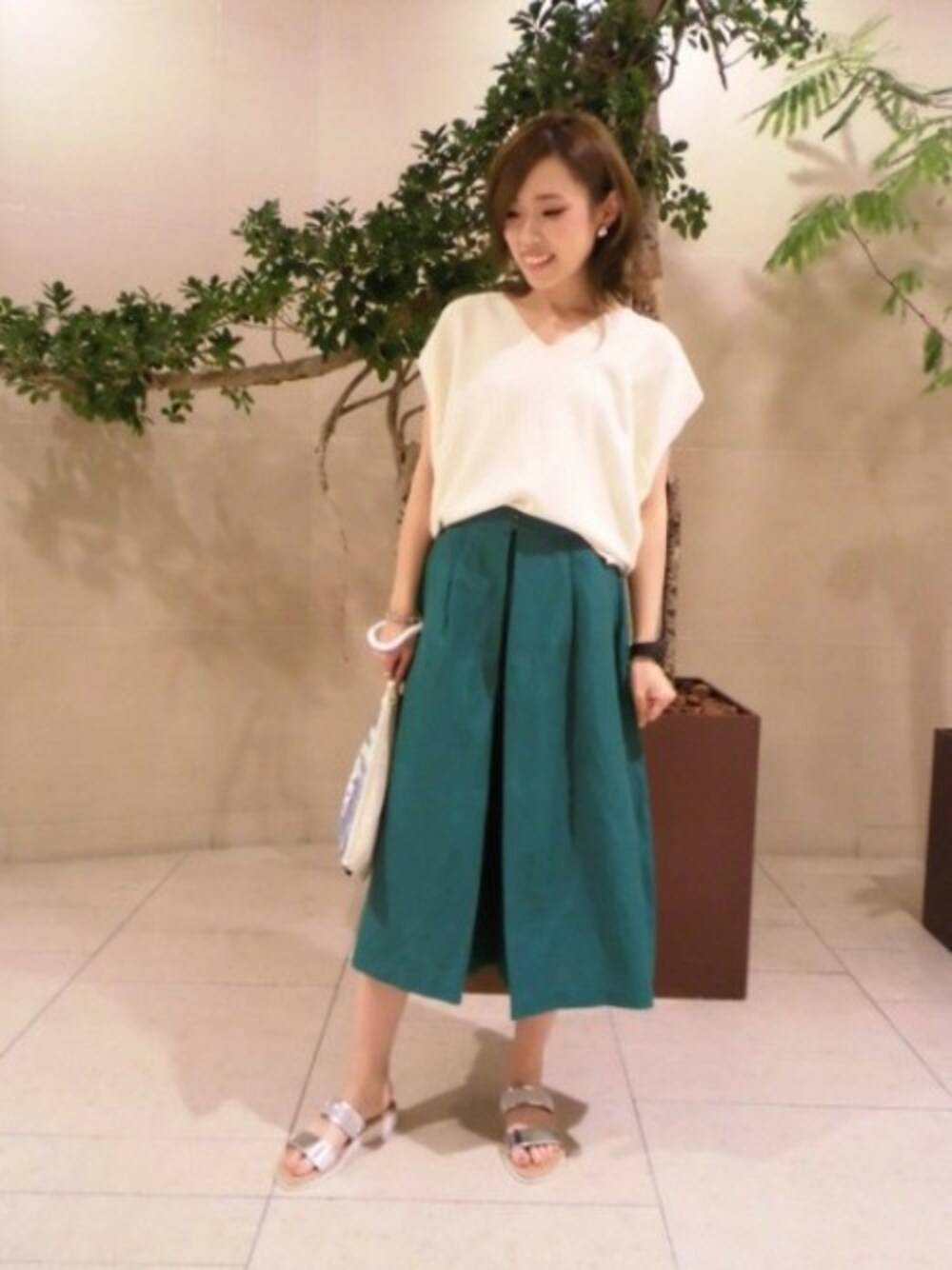 白トップス×カラーパンツでこなれた雰囲気に。 ボリュームのあるパンツでスタイルアップ。