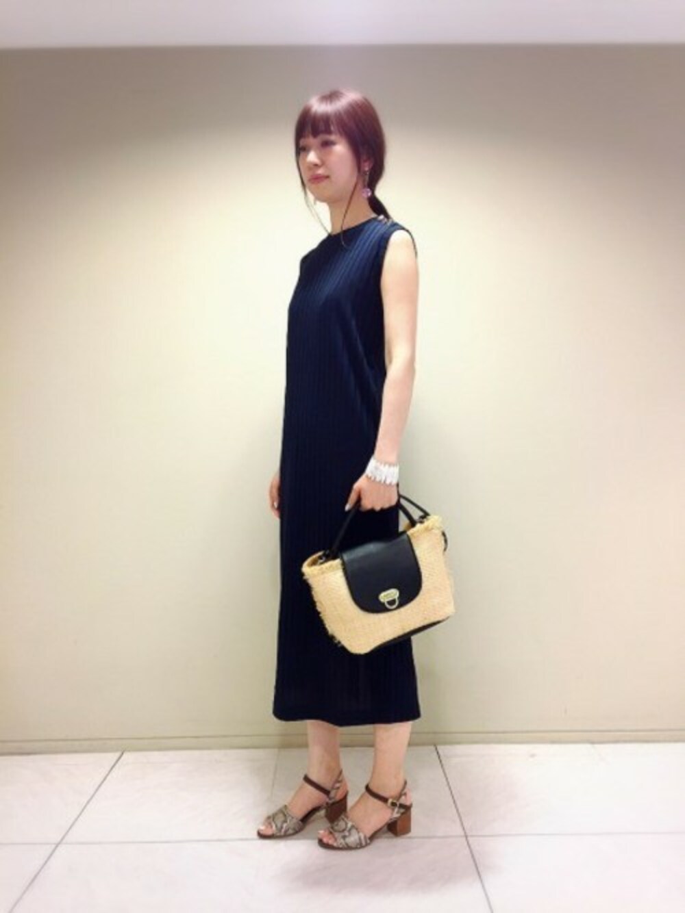 カジュアルになりすぎないキレイめIラインワンピースで大人マリンスタイル。 肩を出しすぎないサイズ感や、ヒップラインが気にならないサイズ感が◎