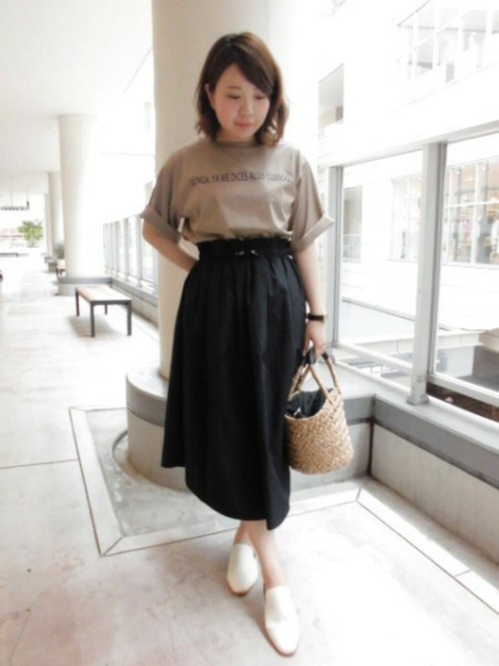 大人のカジュアルスタイル。 Tシャツにフレアカートを合わせてカジュアルになりすぎないように女性らしさを。