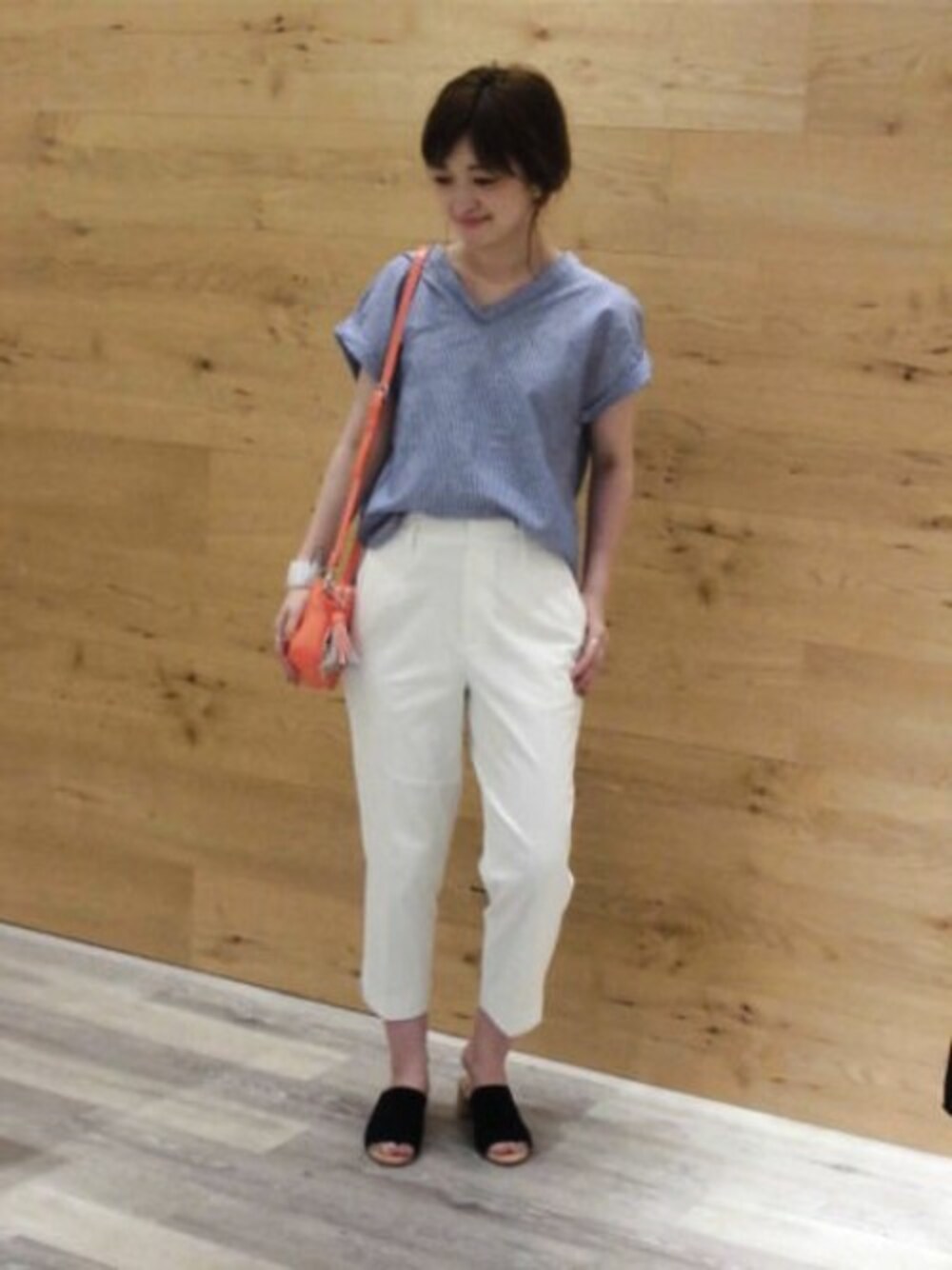 さわやかな夏のカジュアルスタイル。 カジュアルでもデコルテと足首を見せて女性らしさを。