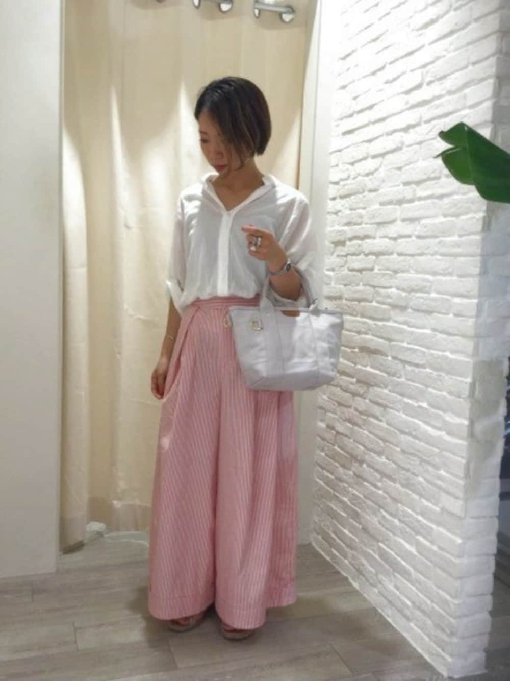 白シャツにピンクのストライプパンツをあわせたスタイル。 ピンクのボトムはワイドなシルエットパンツになっているので 大人っぽく着用いただけます。