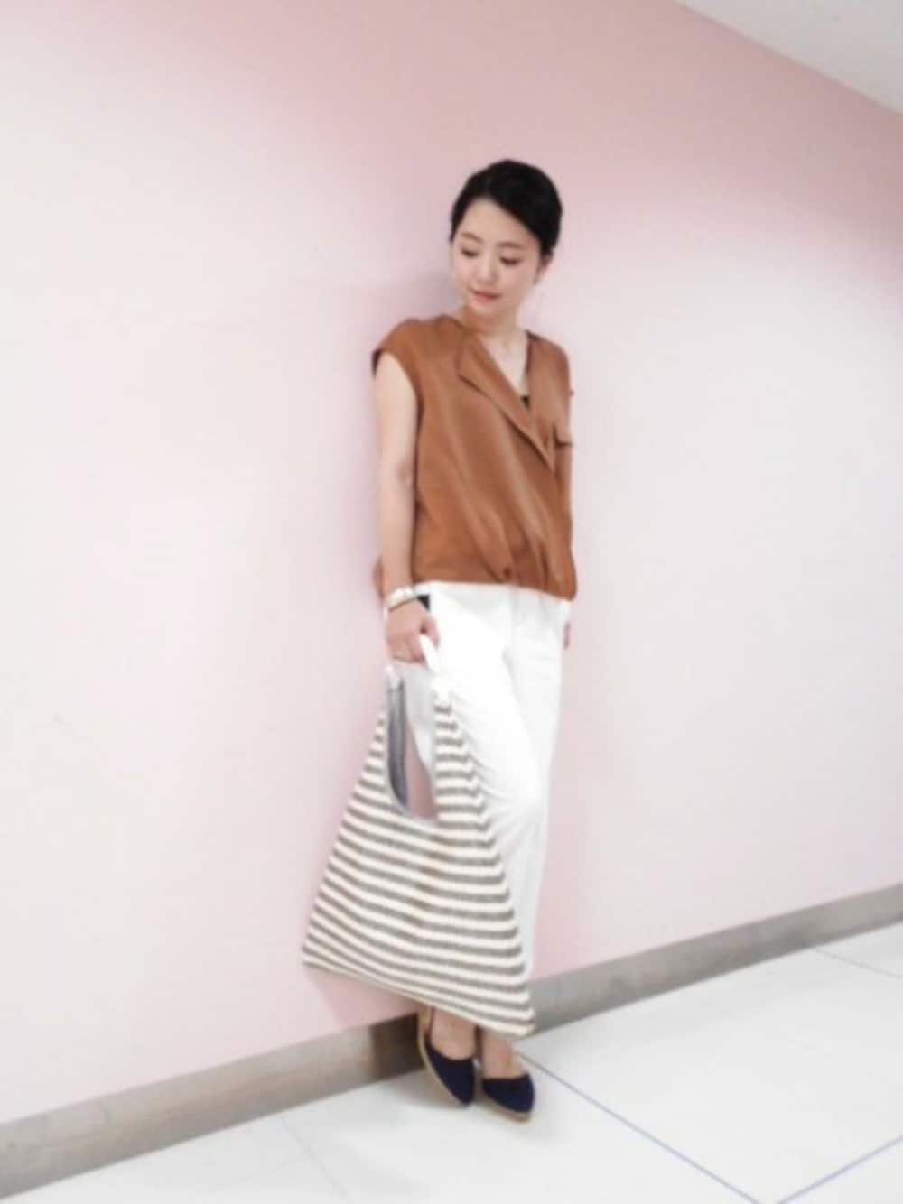上品な大人スタイル。 シンプルな白パンツにきれいめブラウスを合わせてオフィス使いに。 ボトムを変えることでカジュアルダウンもできます。