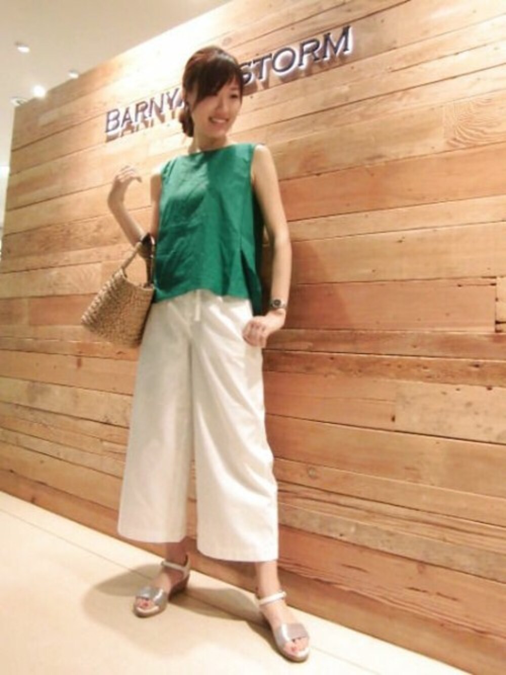 爽やかな大人カジュアルスタイル。 グリーンのブラウスは麻の素材でスカートでもパンツでも◎。 ワイドパンツはしっかり裏地もついているので透け感を気にせず履いていただけます。