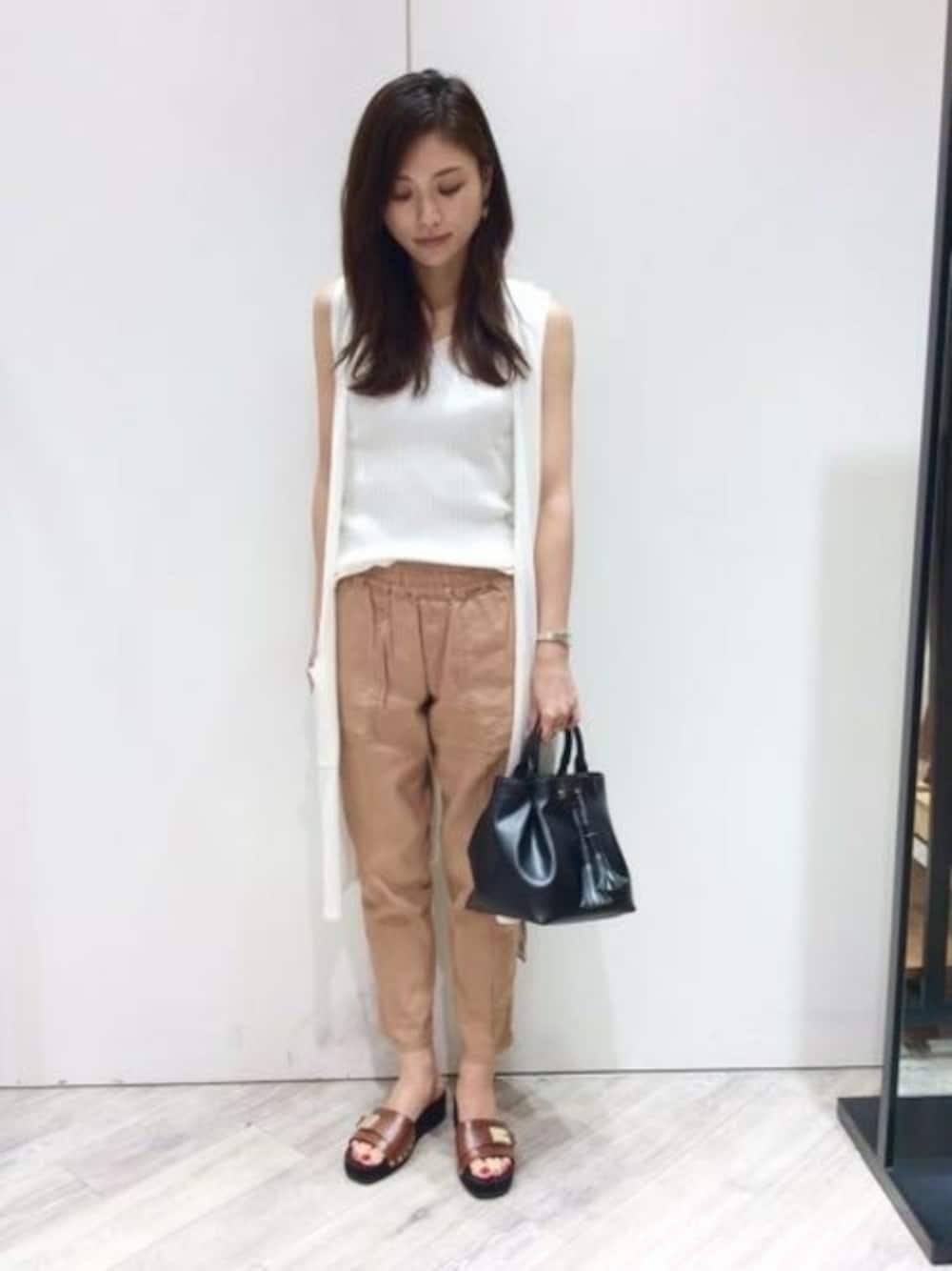 大人のモノトーンカジュアルスタイル。 さらりと羽織れるベストカーディガンとインナーのセットアップ。 ひざ下まであるロング丈が縦のラインを作ってスタイルUPに仕上げてくれます。