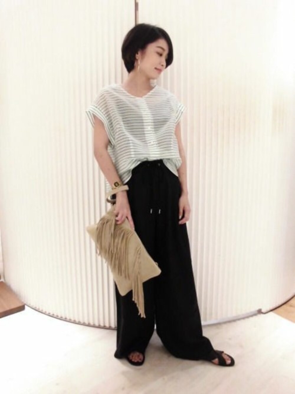 シンプルにまとめた大人スタイル。 さわやかなグリーンのボーダーのトップスに、 ハイウェストのワイドパンツでかっこいいスタイリングです。