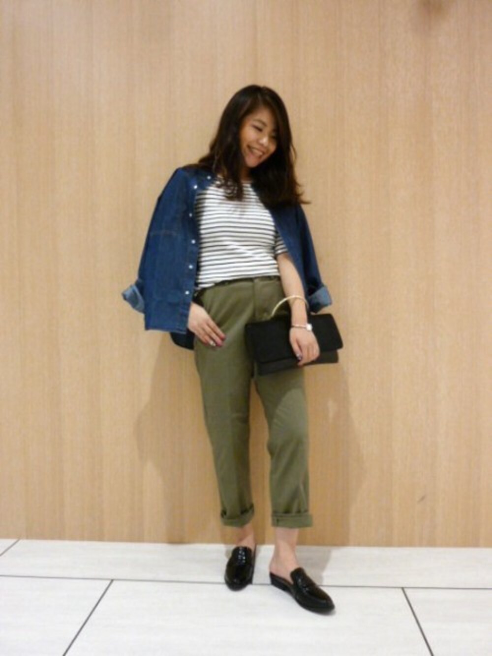 ハンサムカジュアルスタイル。 カジュアルながらもきれいめ小物をセレクト。 ローファー型スリッパシューズはかっちり感もありながら楽チンなのがポイント。