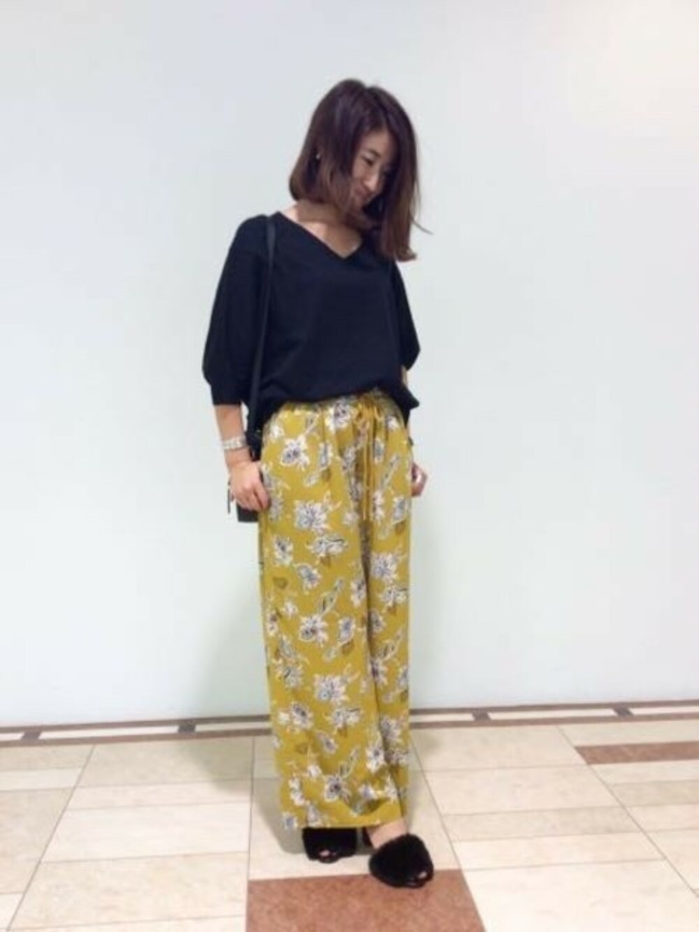 パンツを主役にした大人のカジュアルスタイル。 シンプルカットソーでには、柄物をあわせてこなれた印象に。