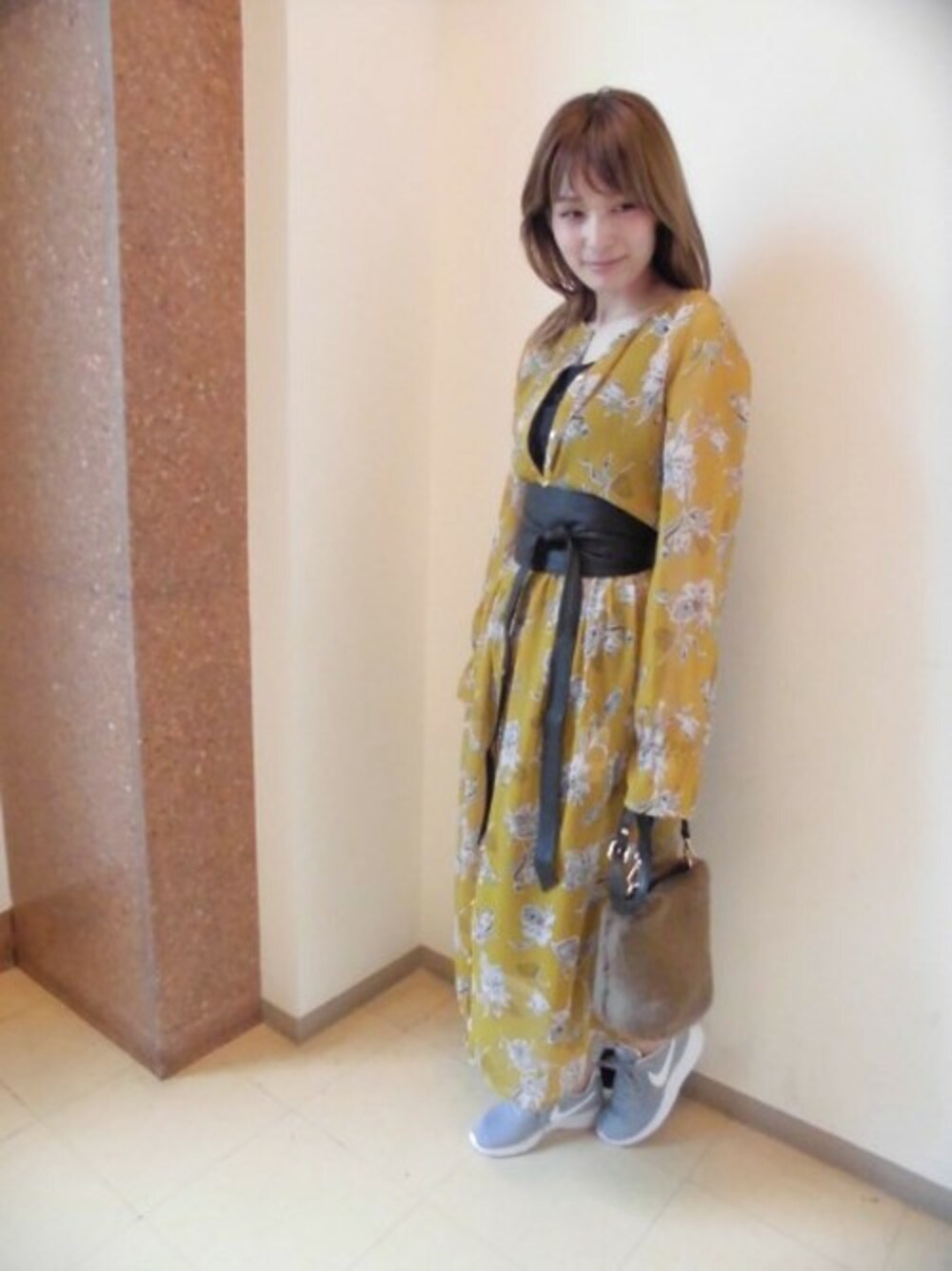 デニムスタイルに花柄ワンピースを羽織ったトレンドスタイル デニムスタイルにワンピースとしてもデニム合わせで羽織りとして着ていただけます! サッシュベルトでメリハリをつけていただいて今年っぽく着ていただくのもオススメです。