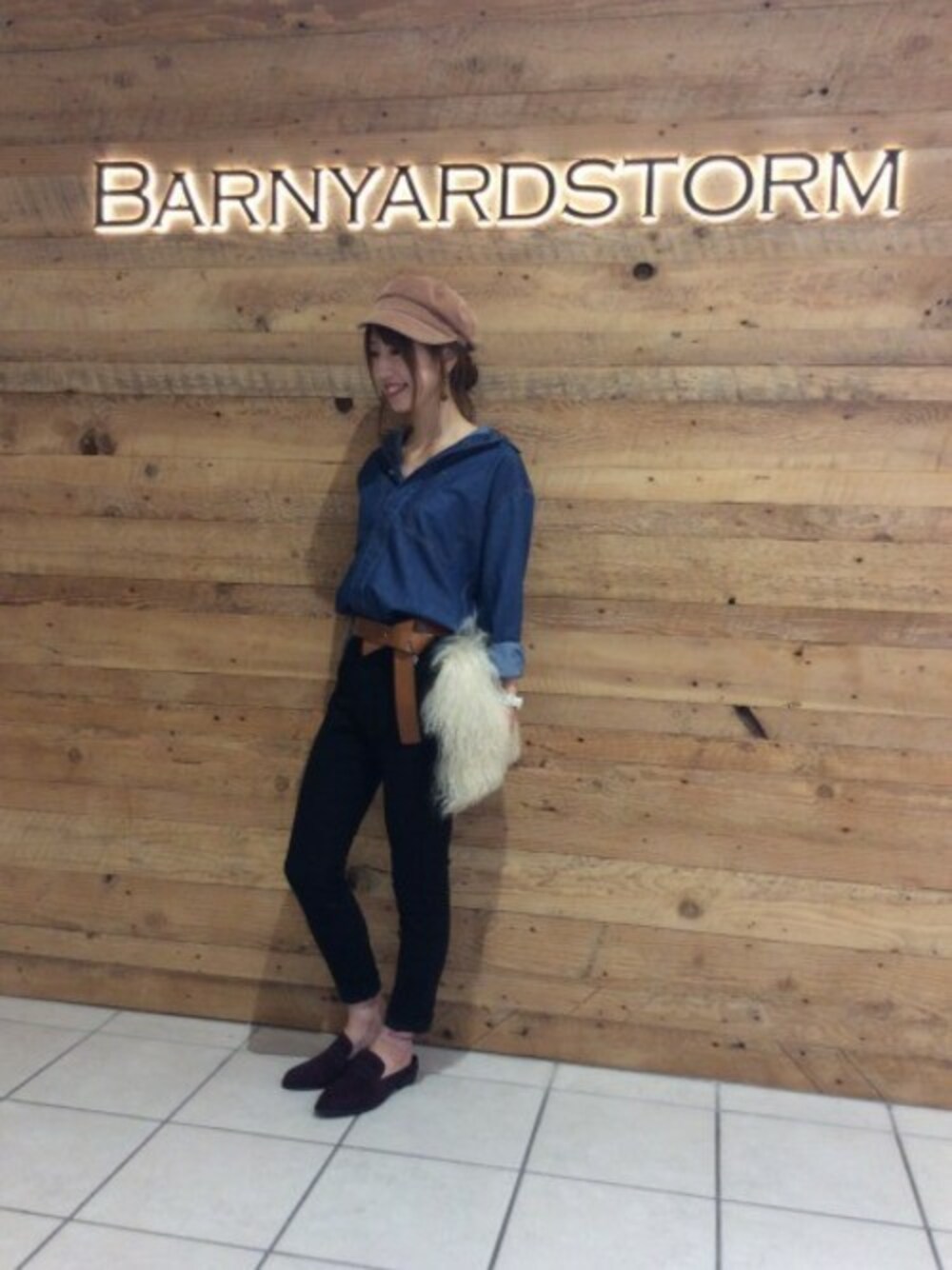 秋先取りカジュアルスタイル カジュアルなスタイルにベルトやトレンドのファークラッチバッグでアクセントを加えました。