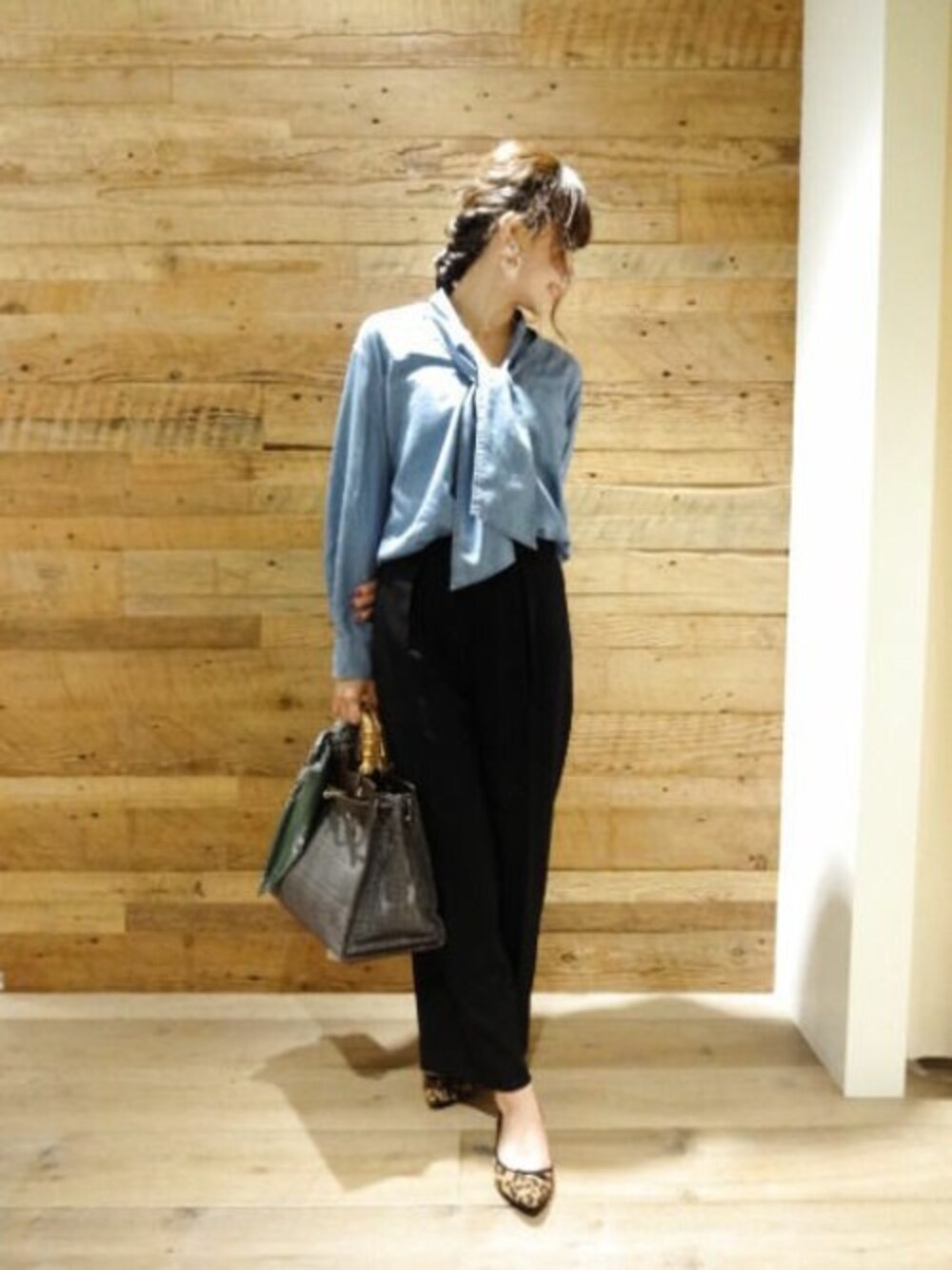 きれいめ通勤スタイル コンサバな印象のあるボウタイブラウスをデニム素材でカジュアル感を。 きれいめパンツと合わせてきれいめコーデにまとめました。