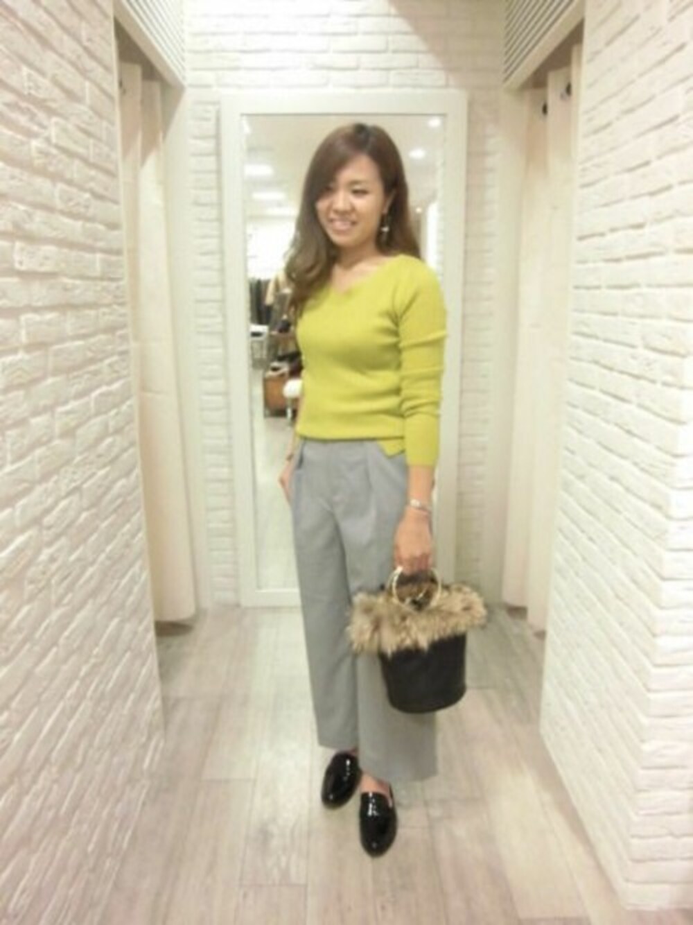 きれいめパンツスタイル 鎖骨ラインがきれいに見えるVネックで品良く着れるトップスに セミワイドなボトムと合わせてきれいめな印象になるようにまとめました。 ペタンコのローファー型スリッポンを合わせてカジュアル感をプラス。
