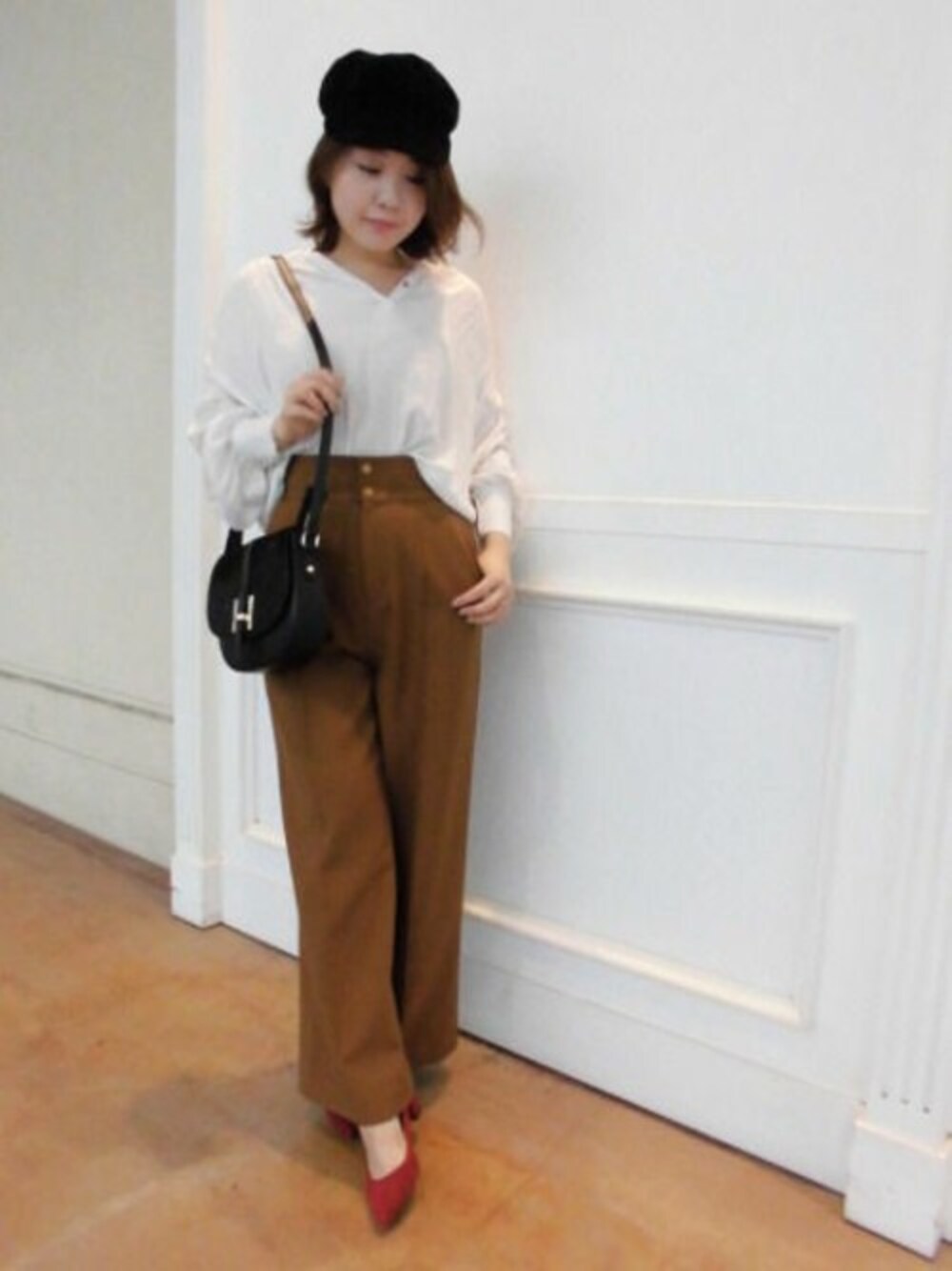 スタイルよく見えるハイウエストのパンツスタイル サテンブラウスにハイウエストパンツで女性らしいコーディネートになります。 ハイウエストパンツはスタイルアップ効果も抜群です。