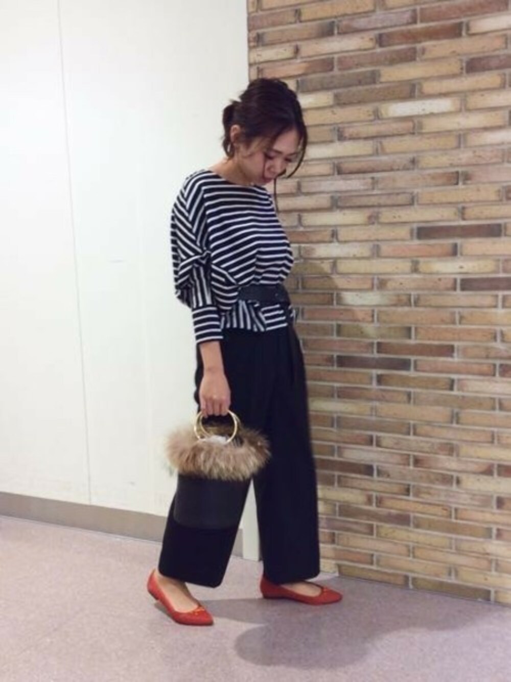 シンプルな大人のカジュアルスタイル ウエストマークすることですっきりした印象に。 1枚で存在感のあるトップスなのでシンプルにまとめるのが◎