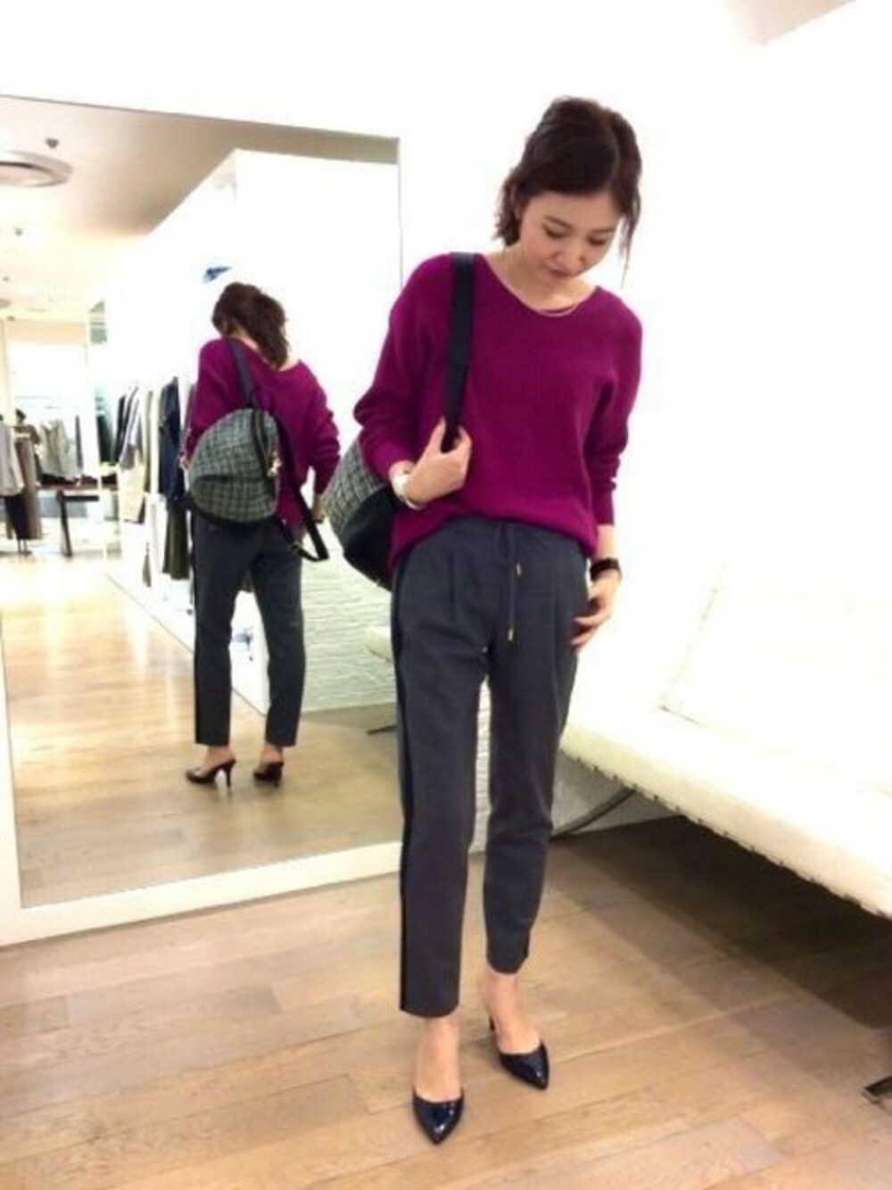きれいめカジュアルスタイル 女性らしいニットとヒールには、今季トレンドのスポーティーなラインパンツを合わせて スポーツと綺麗めミックススタイルにまとめました。