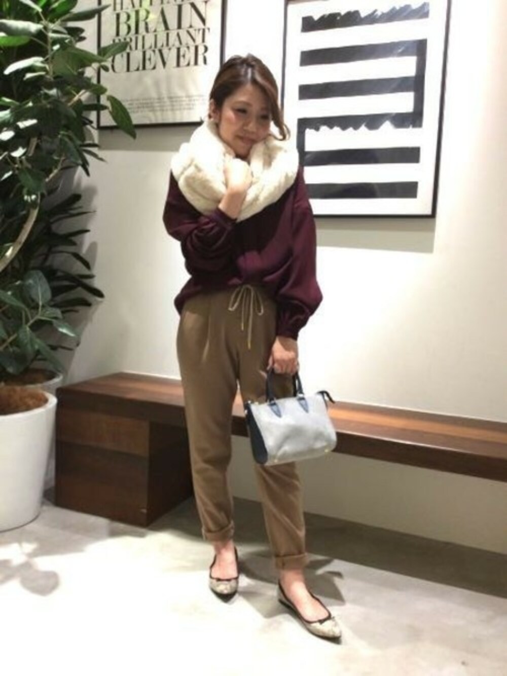 秋カラーのきれいめパンツスタイル バーガンディーの色がきれいに映えるブラウスに細身のパンツを合わせてきれいめカジュアルにまとめました。 肌触り抜群のフェイクファースヌードは顔回りをしっかり包んでくれて防寒効果◎