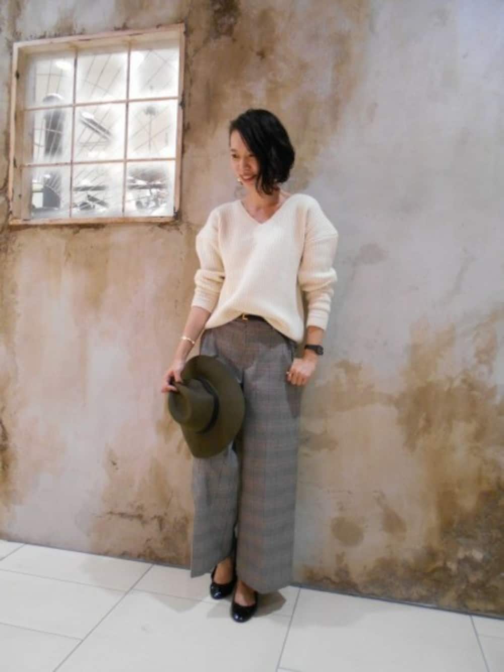 グレンチェックパンツでハンサムスタイル 今季トレンドのグレンチェック柄のワイドパンツでシンプルにまとめました。 Vネックのシンプルニットと合わせることですっきりしたきれいめスタイルに仕上がります。