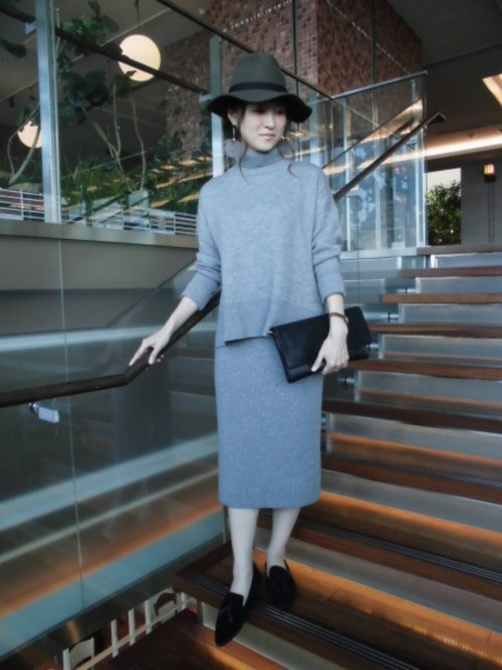ニットのセットアップスタイル ニットのセットアップは着回し抜群! 薄手のニットですので、アウターのインナーとしても使えますよ!