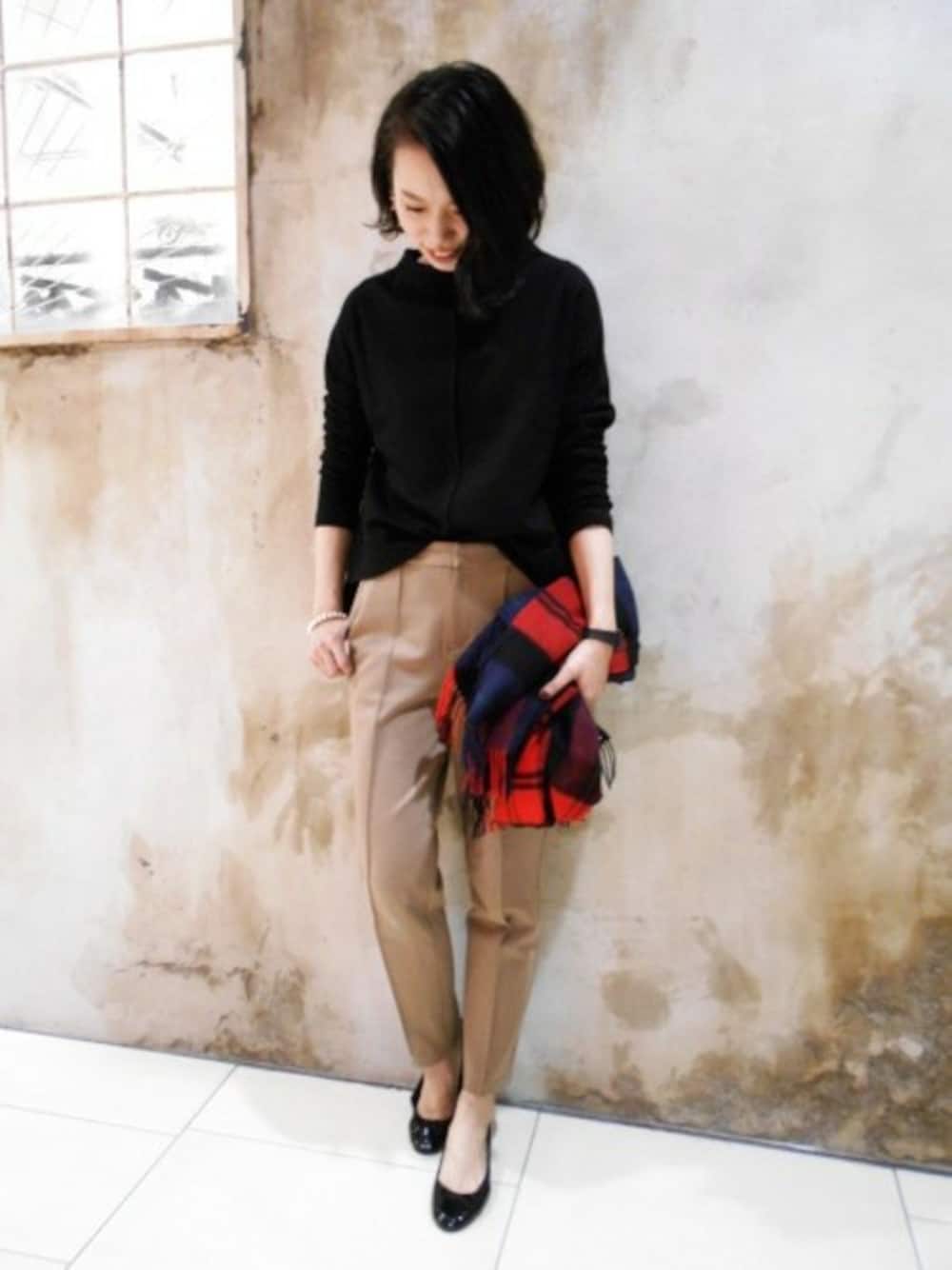 ストールマフラーがポイントに。シンプルなパンツスタイル 綺麗めカジュアルコーデに取り入れやすいプルオーバーはテーパードパンツとの合わせが◎