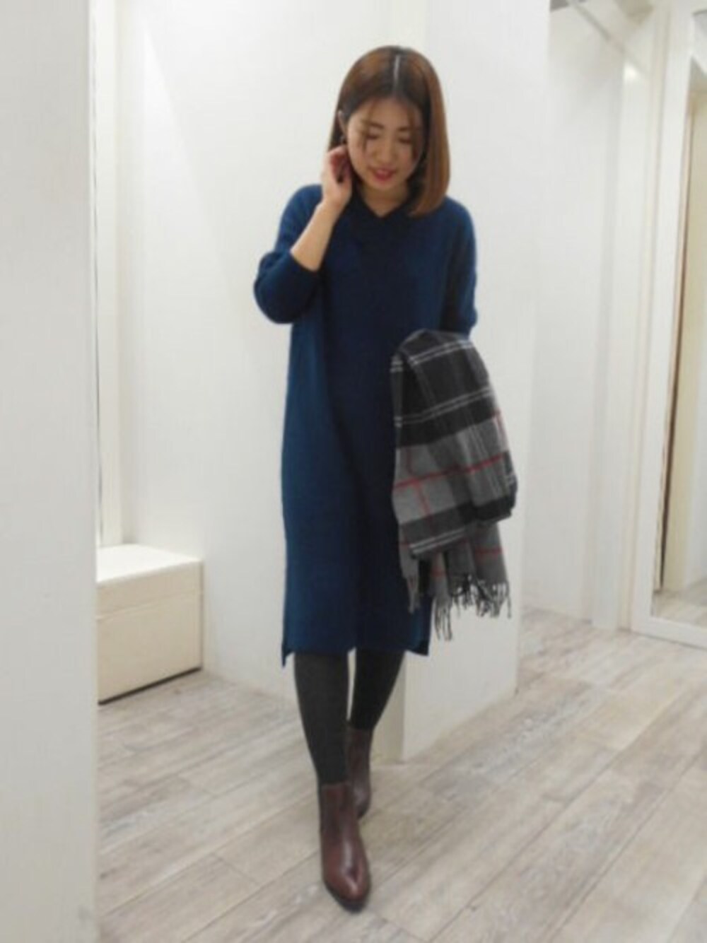 シルエットがきれいなワンピーススタイル 1枚でワンピースとしても着ていただくと上品な印象に。 タイツとあわせてきれいめにまとめました。