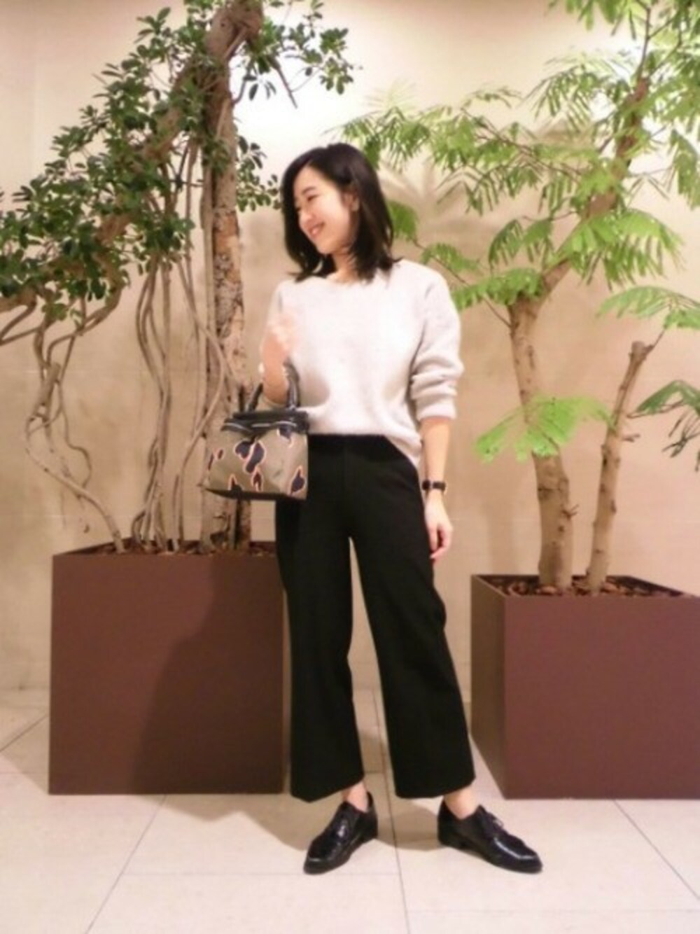 シンプルなモノトーンスタイル シンプルなコーデの時は小物で遊びアイテムを。
