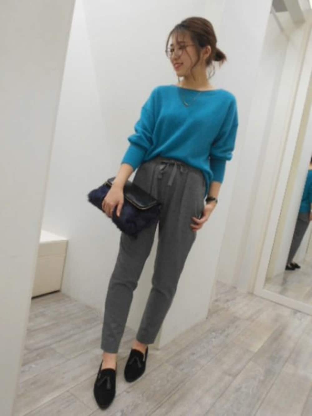 グリーンのトップスで一気に華やかに見えるハンサムスタイル グリーンのトップスにはシンプルにブラックやグレーでまとめたスタイルがGOOD。