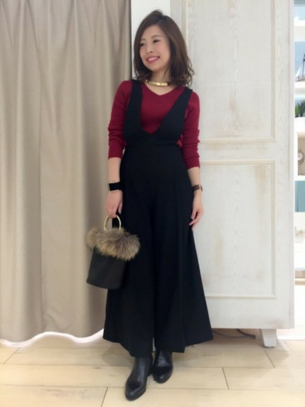 オールインワンとしてシンプルニットとレイヤードしたスタイリング Vネックラインの赤ニットとレイヤードしてすっきりした印象に。 ボリューム感のあるワイドパンツでシルエットを綺麗に見せてくれます。