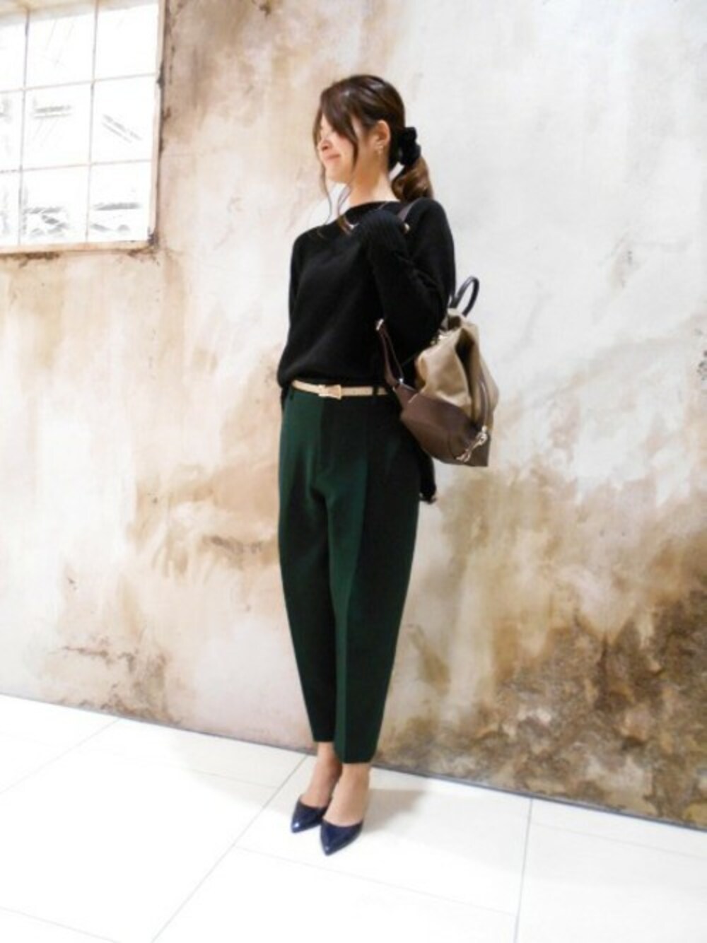 きれいめカジュアルスタイル ボトムを選ばない丈感とスッキリとしたボートネックの衿開きや脇スリット、長めの袖丈がとてもバランス良く計算されたニットです。 深いグリーンが綺麗なパンツとあわせたシンプルなスタイルがおすすめです。 足元はパンプスと合わせて足首を見せることで女性らしく華奢な印象に