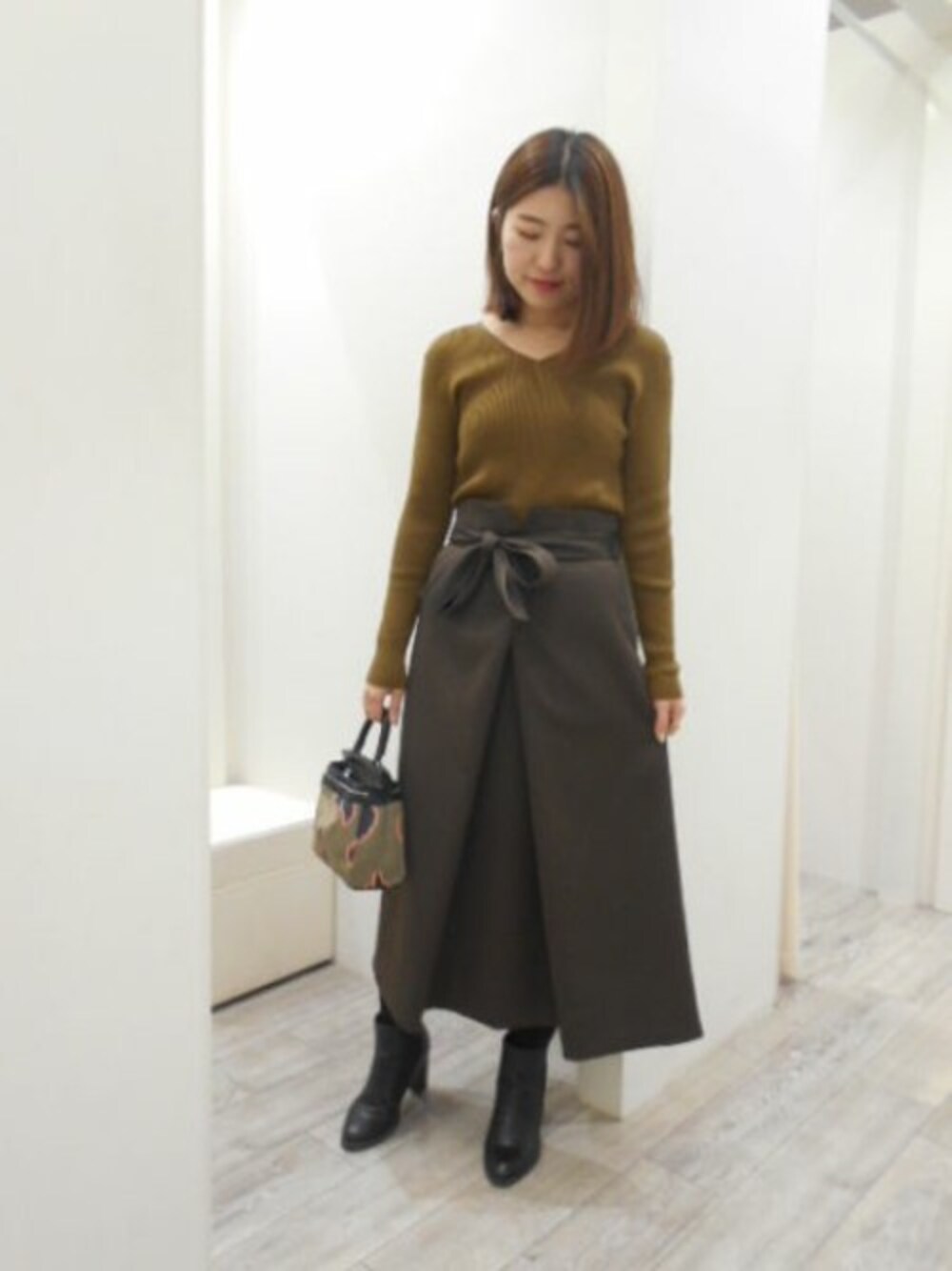 同色系でまとめたグラデーションスタイル シンプルなVネックニットにはハイウエストスカートを合わせてすっきりした印象に。 Aラインのロングスカートはグンと女性らしさを引き立たせてくれます。