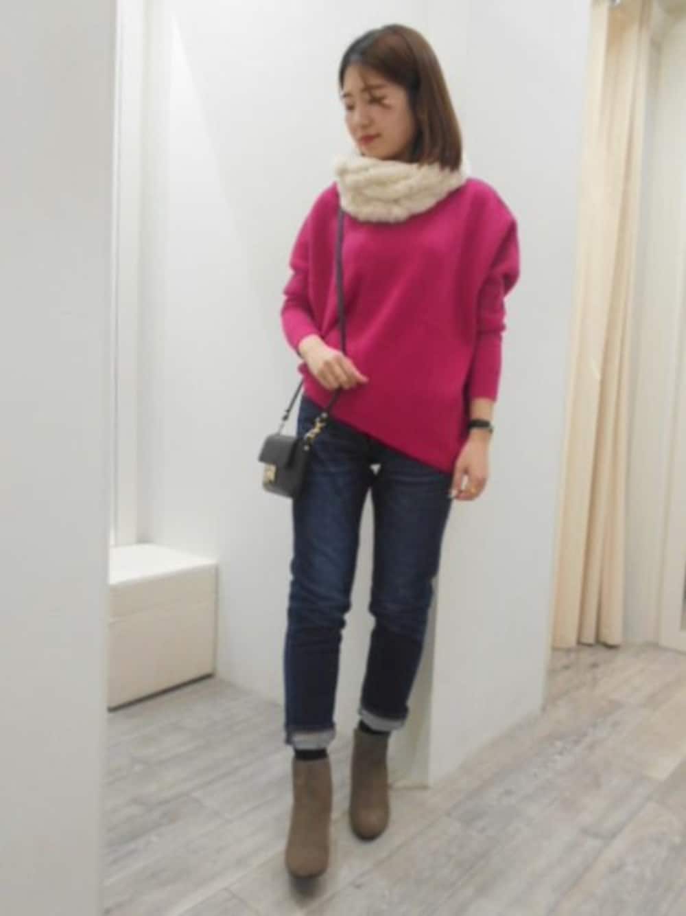 ピンクのニットが映えるカジュアルすたりう ベーシックスタイルにはカラーニットを取り入れるだけで一気に華やかな印象に。