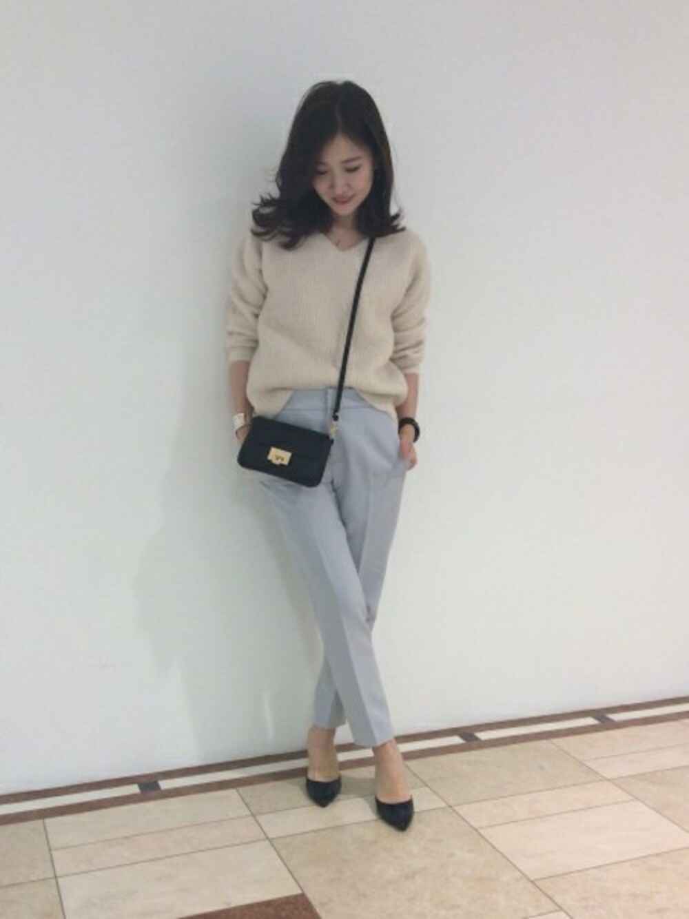 ニュアンス感あるこなれたパンツスタイル 優しい色合いのニュアンスカラーでまとめたコーデに小物は黒アイテムをあわせてメリハリをつけました。 ニュアンスを演出できるこなれた感あるスタイリングです。