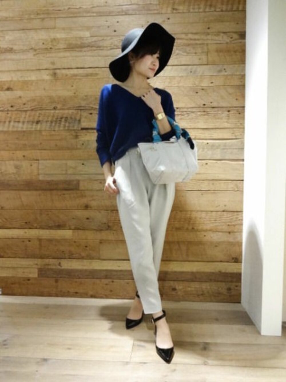 上品なきれいめパンツスタイル カラーニットにきれいめのテーパードパンツを合わせた上品な装いに。 小物もきれいめをチョイスしました。