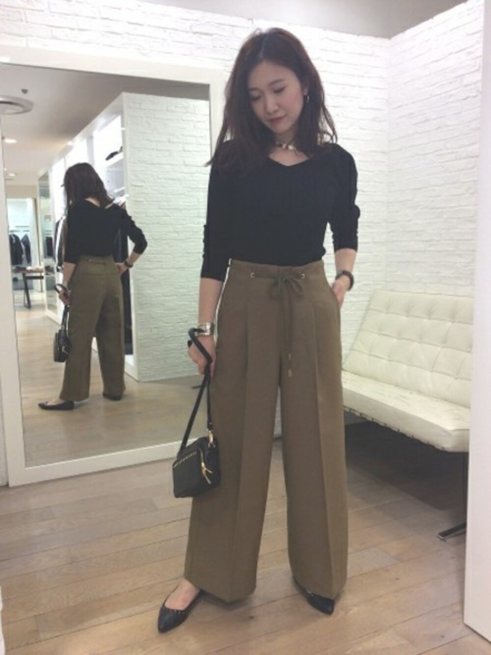 モノトーンでまとめたハンサムなパンツスタイル ハイウエスト、ロープ紐使いで脚長効果抜群のきれいめワイドパンツ。 程よくフィット感のあるニットをINすることですっきりとした印象にしてくれます。