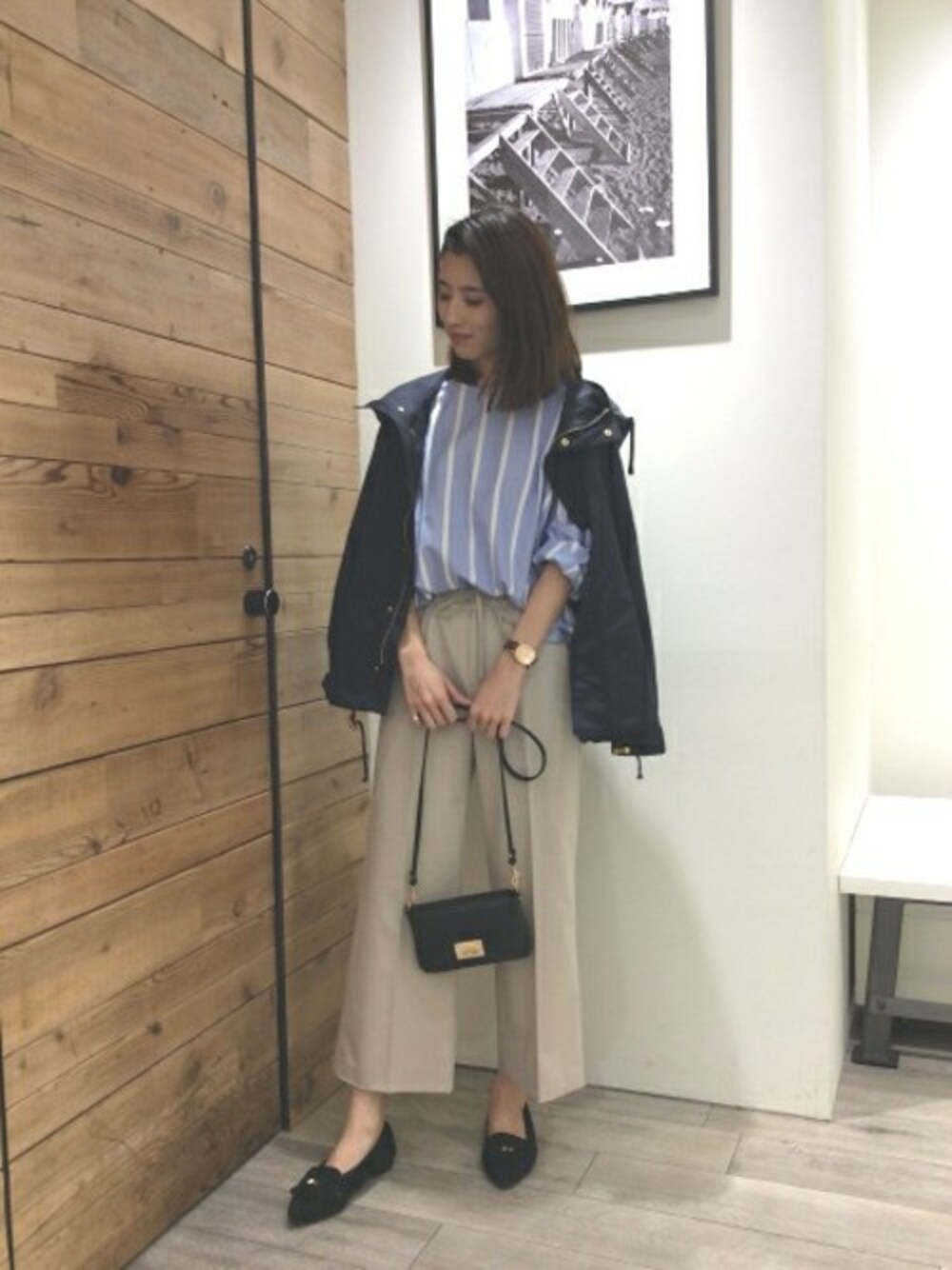洗練された上品さ漂うハンサムパンツスタイル きれいめな印象のストライプブラウスはきれいめパンツと合わせて洗練された大人のスタイリングに。 ウエストをインして一枚でキマるブラウスです。 小物はかっちりしたきれいめをセレクトしました。