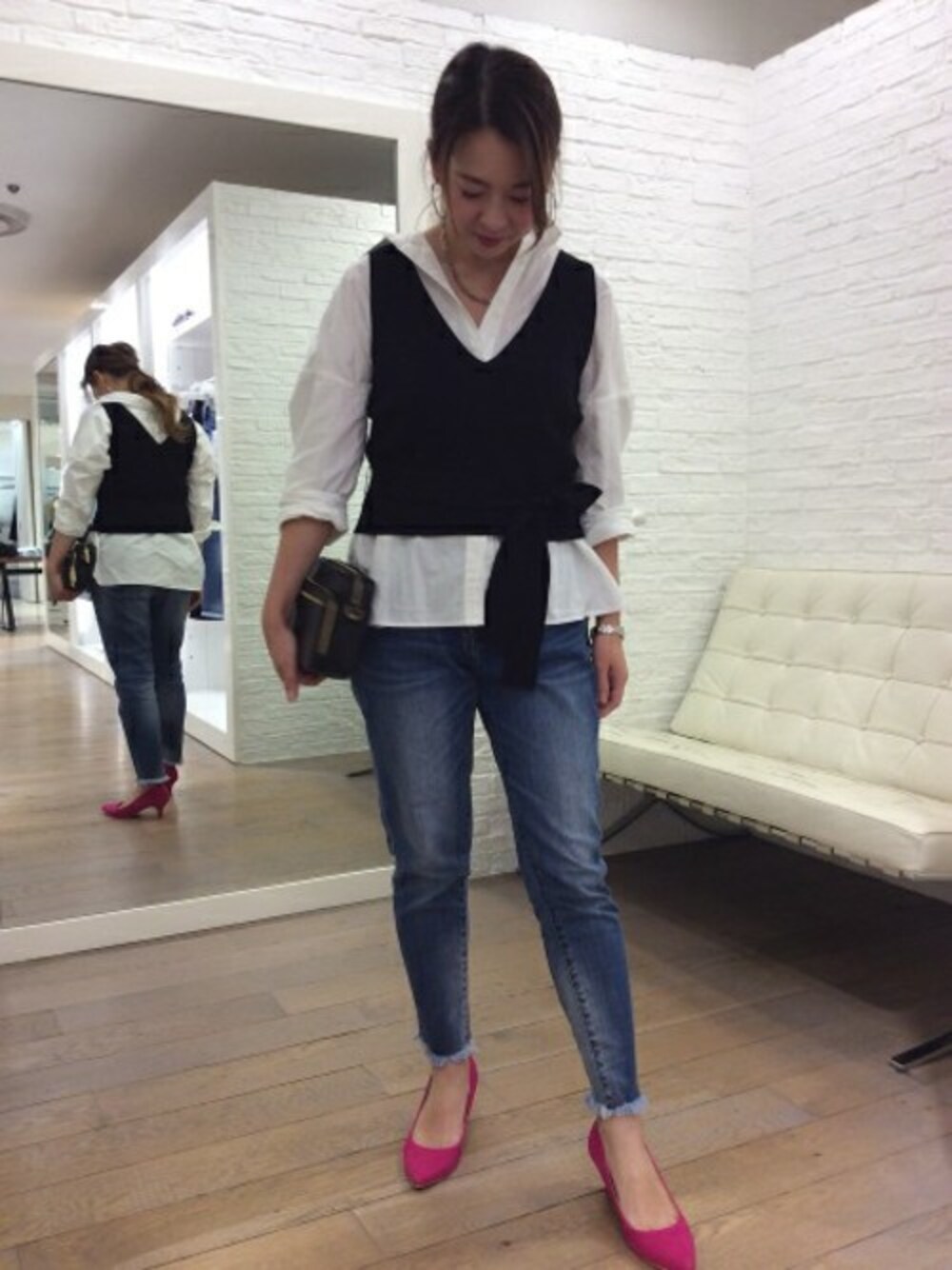 ビスチェとレイヤードしたいつもと違ったシャツスタイル 白シャツにはベーシックなデニム合わせが相性◎ いつものシャツスタイルにビスチェをプラスするだけでシンプルなスタイリングからぐっとおしゃれ感がアップします。 袖をまくり、襟元を抜いたスタイリングでこなれ感を。