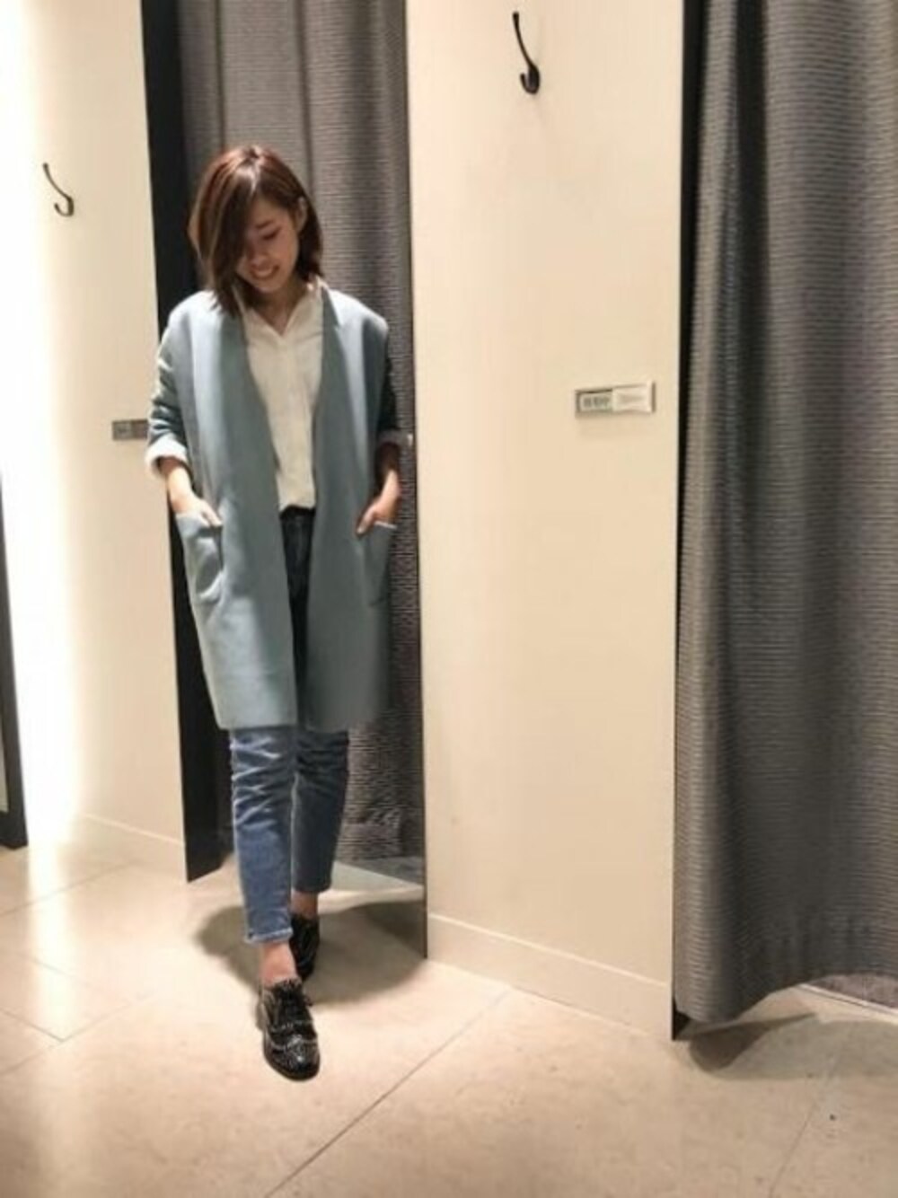 洗練された上品なカジュアルスタイル 白シャツ×デニムパンツでハンサムスタイルの完成です。 コートインできるのでロングシーズン使えるニットコーディガンを羽織って上品な印象に。