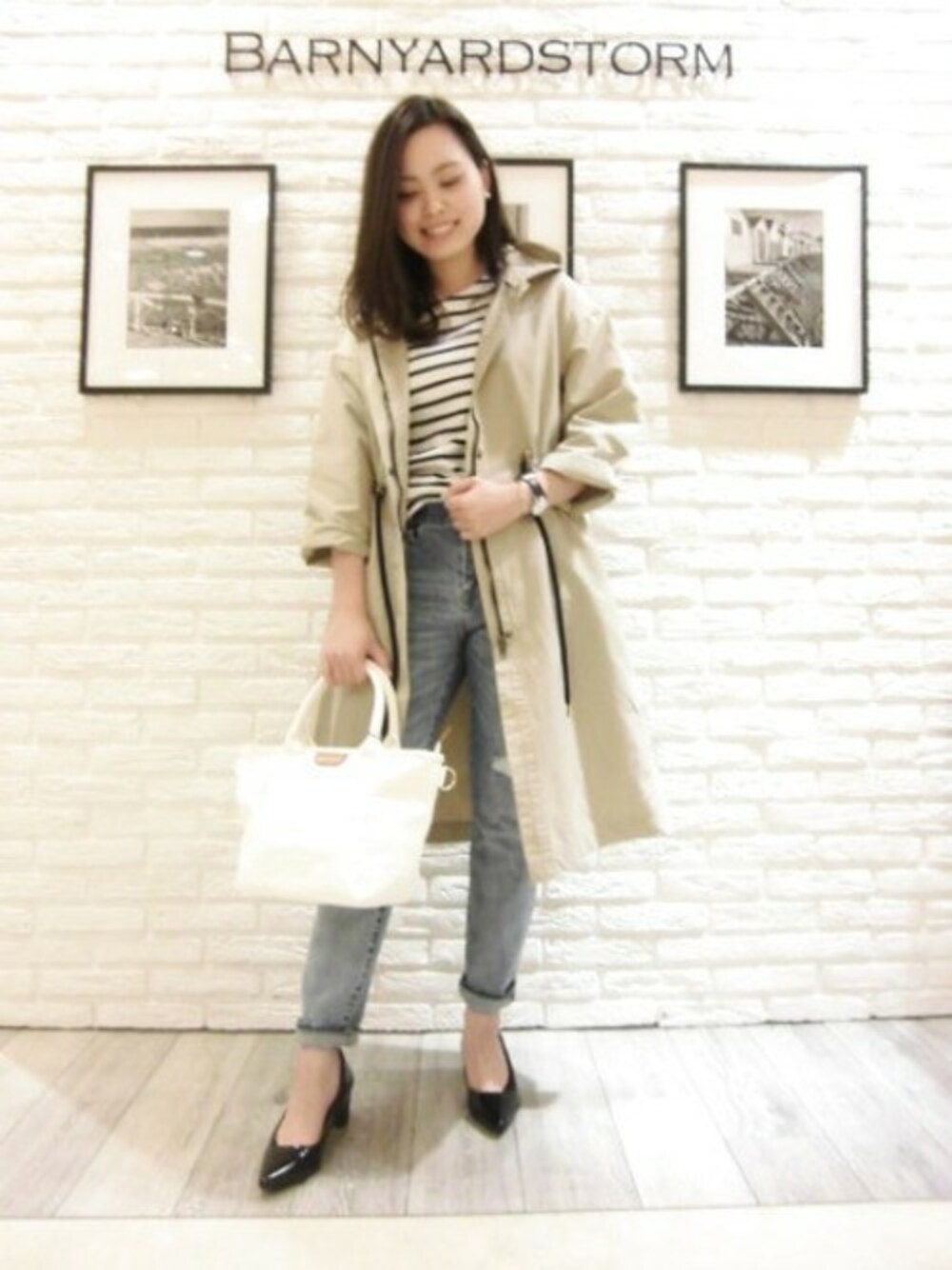 ハンサムなカジュアルデニムスタイル 羽織るだけでハンサムに着こなせるのに女性らしい雰囲気が つくれる春にピッタリの春アウターです。 コートの中はボーダー×ダメージデニムでカジュアルに。