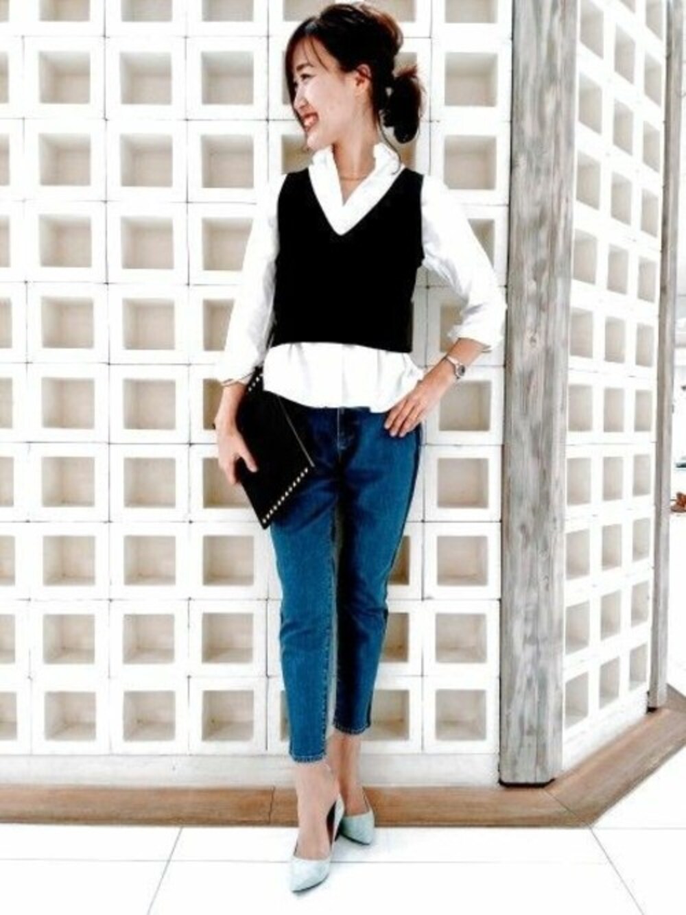 爽やかなシャツスタイル サイドラインがアクセントになったスポーツ要素をプラスしたデニムパンツ。 白シャツを合わせて大人っぽくハンサムにまとめました。 ビスチェをレイヤードすることでいつもと違ったシャツスタイルを楽しめます。